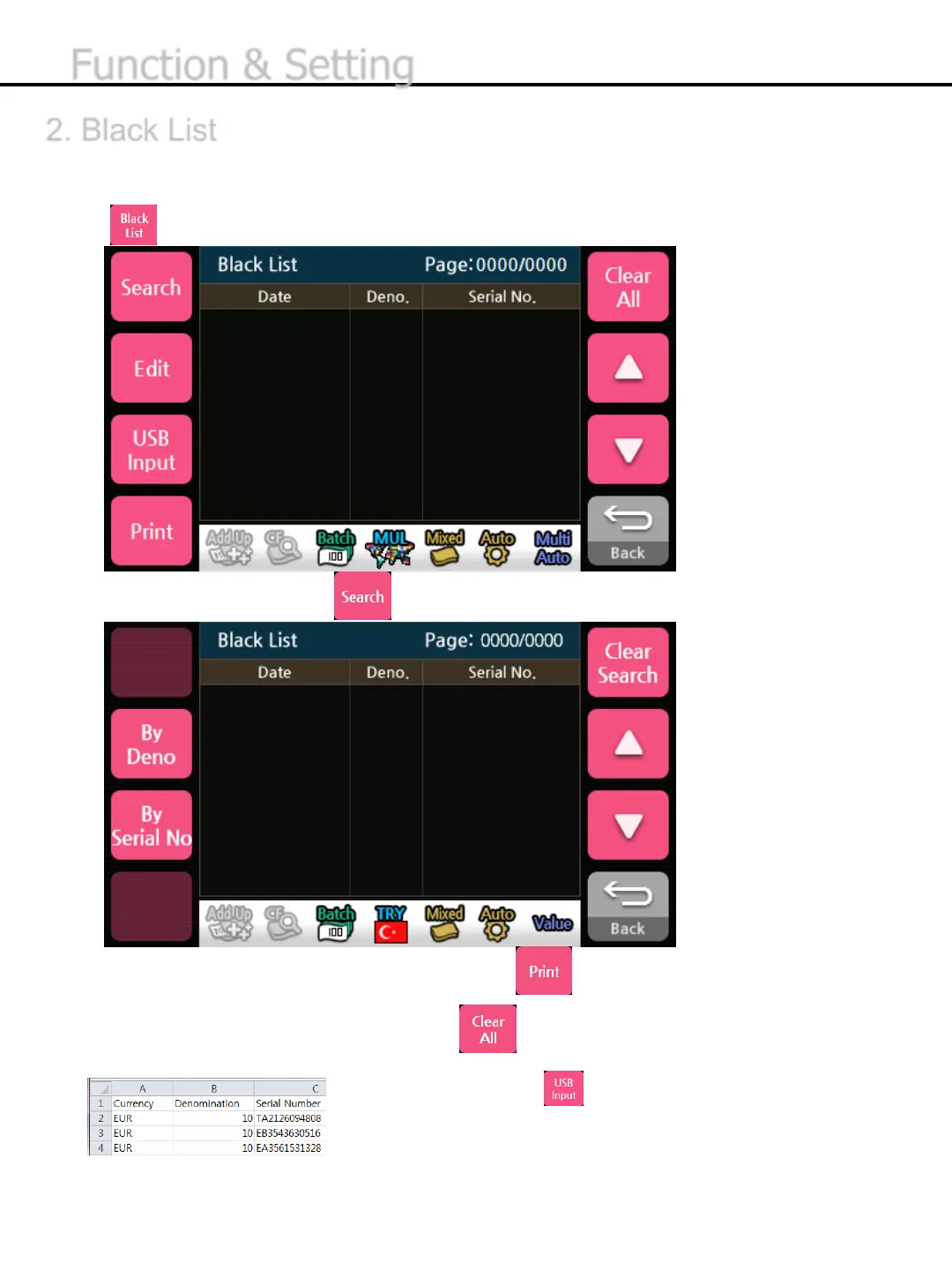 This table shows the information of Black List saved. If the scanned serial number of banknote is in