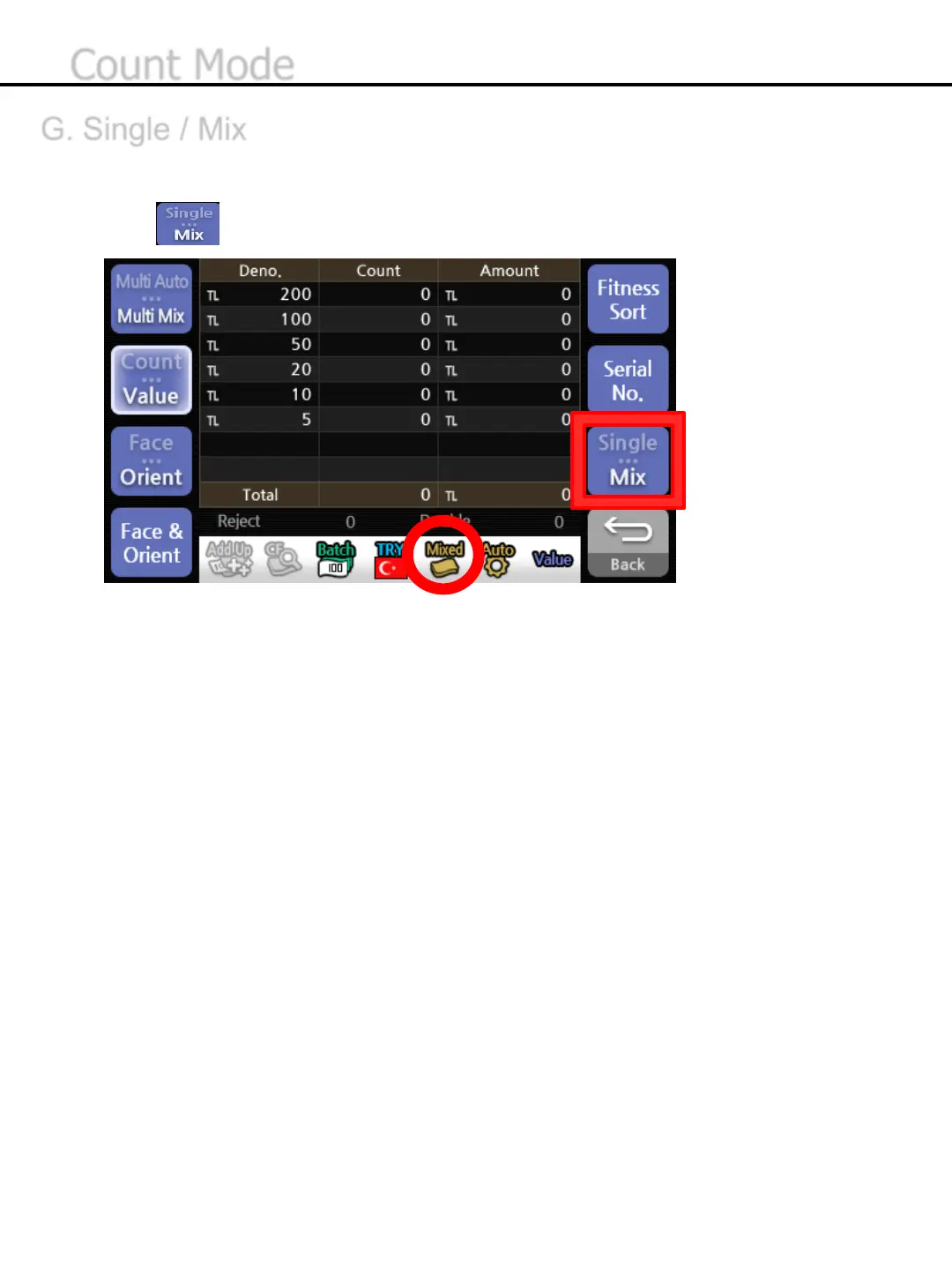 reject pocket. Mix Mode is to count all of the denominations if it’s the same currency.