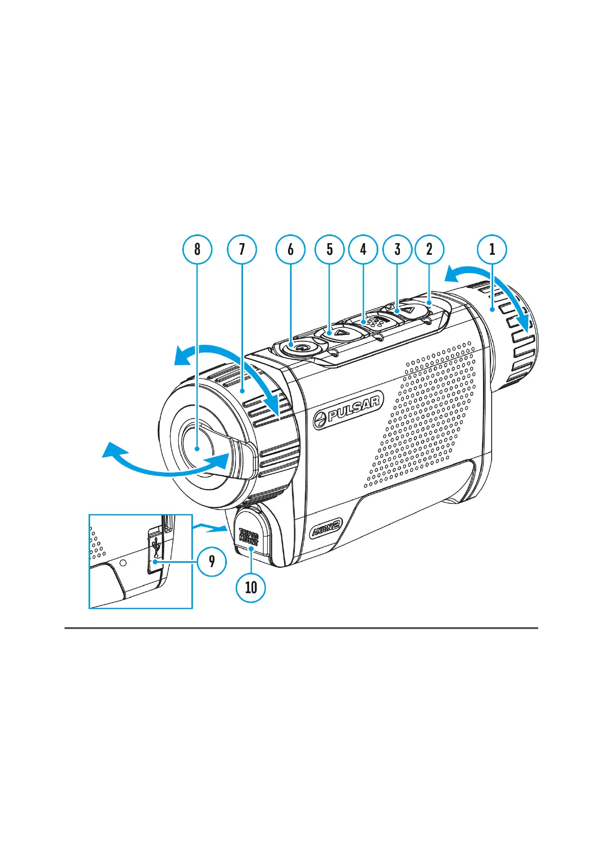 Rotate the lens focus ring (7) to focus on the object being observed.