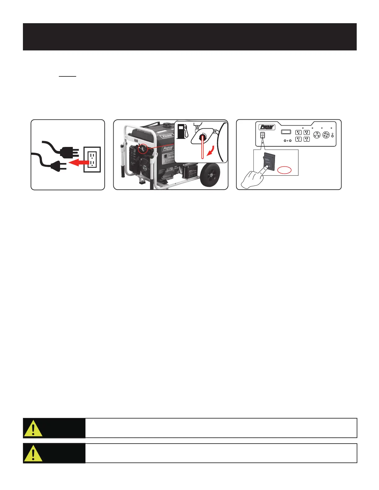 • All loads MUST be disconnected from the generator. Never start or stop the engine with electrical devices plugged in to