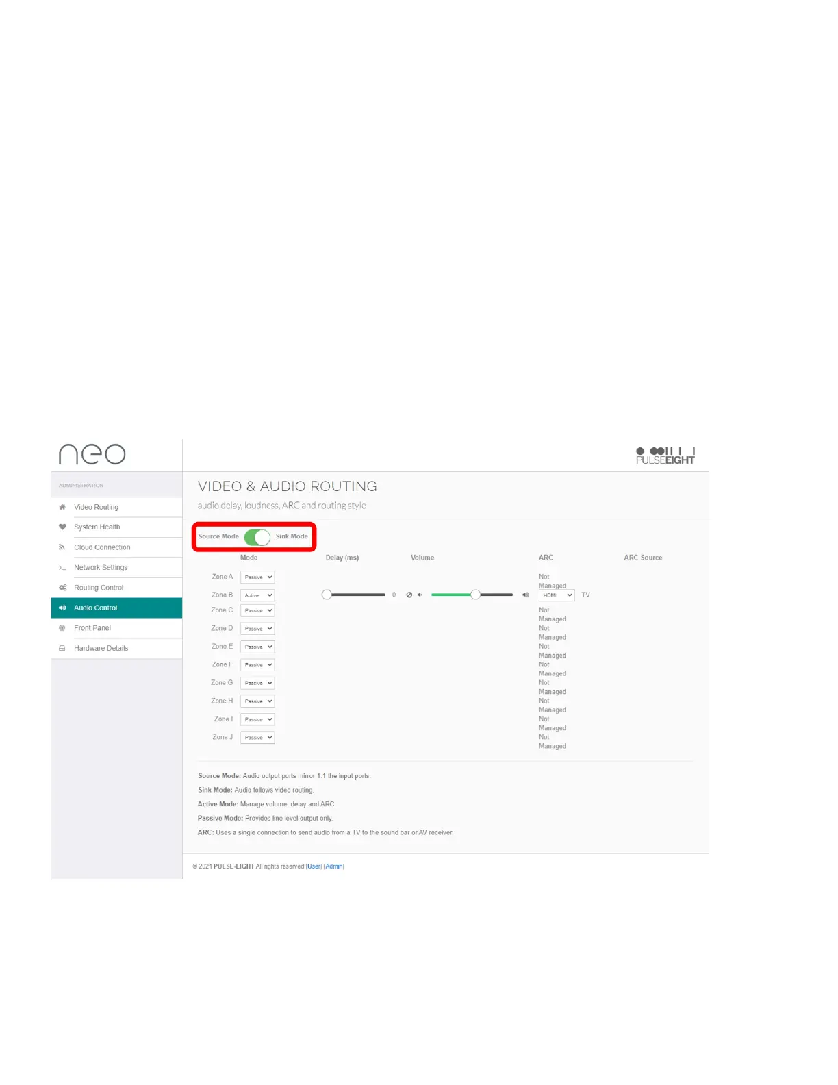 SourceModeisthelegacyroutingwheretheaudiooutputs1to8arelockedtoHDMIinputs1to8