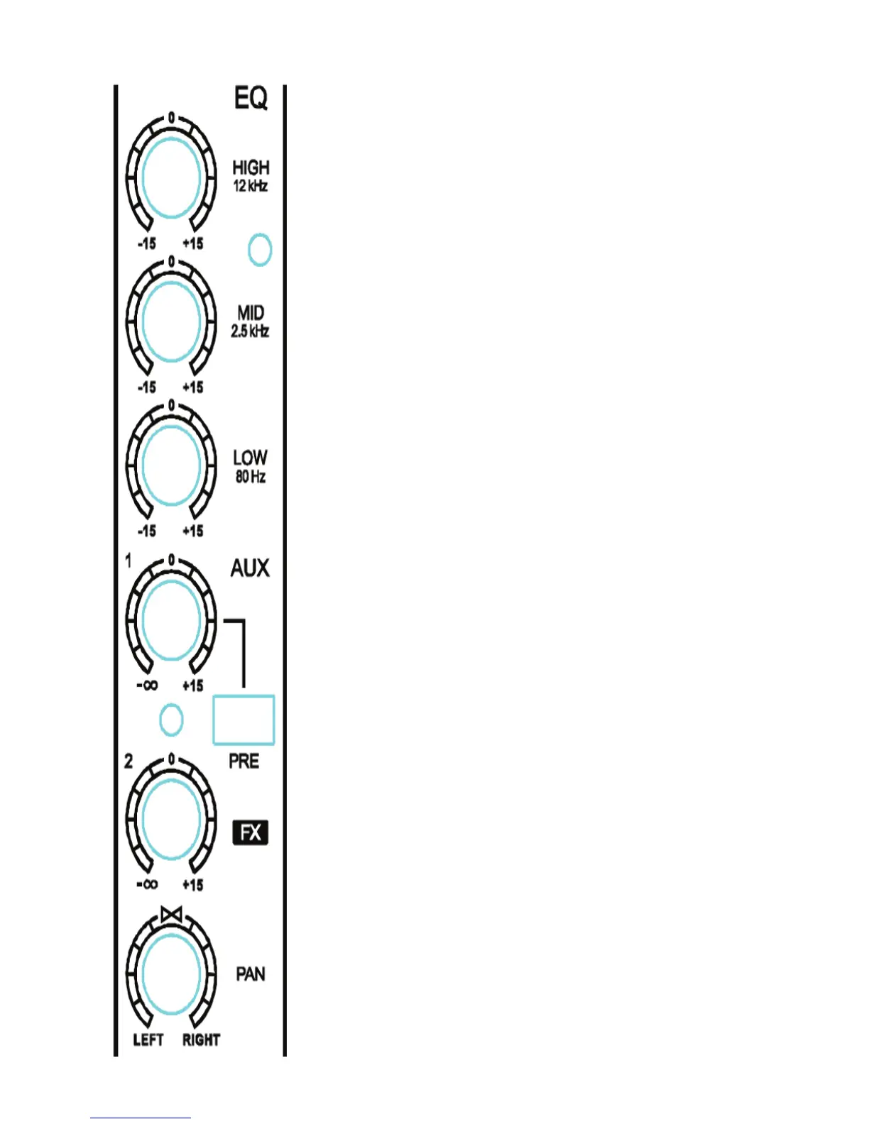 Pulse PMX1204 - EQUALISER (EQ) AND CHANNEL CONTROLS; EQUALISER. HF,MF, LF; EQ Band Adjustment; AUX, FX, and PAN Controls