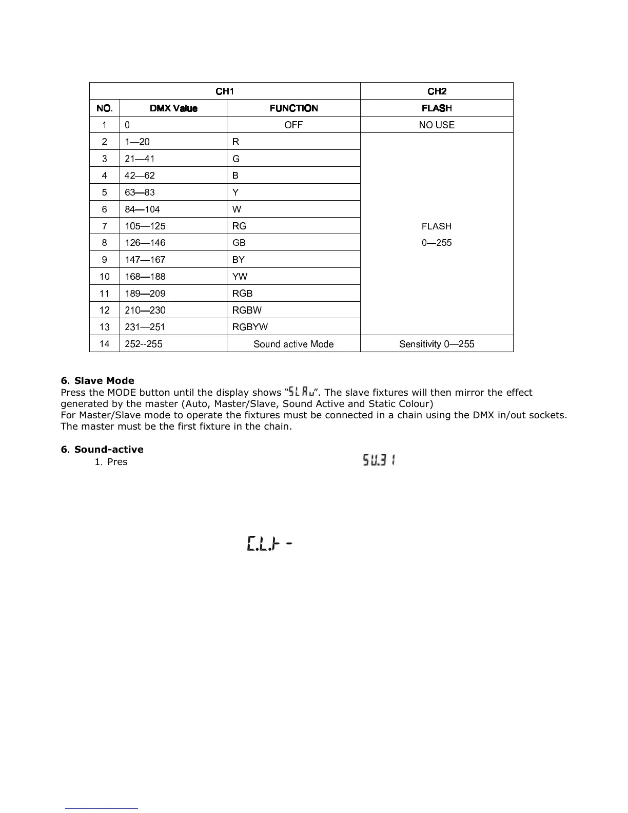 Press the MODE button until the display shows “ ”. The slave fixtures will then mirror the effect