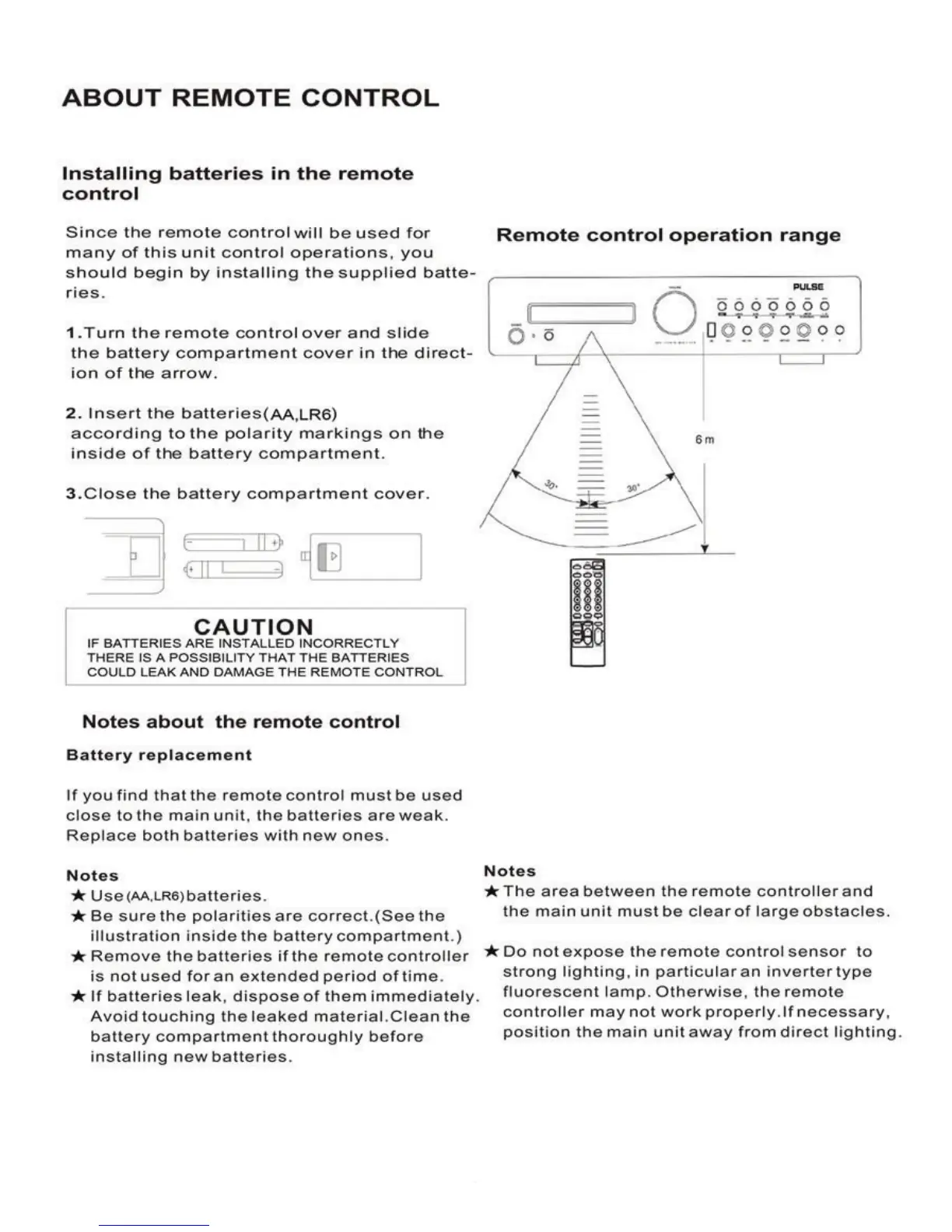 Pulse SRA-160USB - About Remote Control Operation; Installing Batteries in the Remote Control
