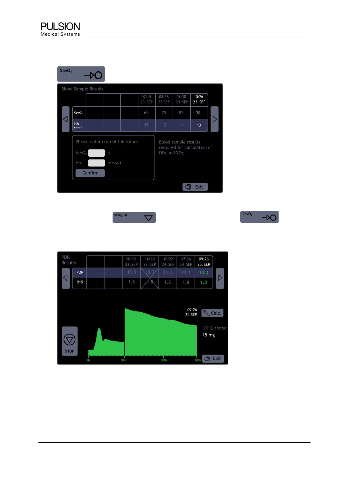 During the review the values appear in green colour and the corresponding ICG curve is displayed. Older