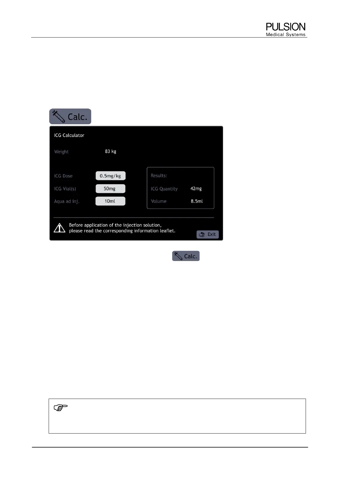 Calculated values of ICG quantity and volume dependent on the entered data. Calculated values are