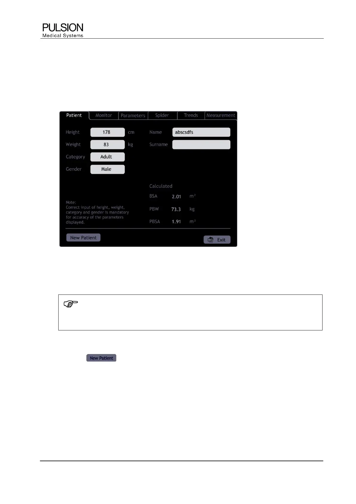 The button allows the admission of a new patient. Existing trend information and calibrations will
