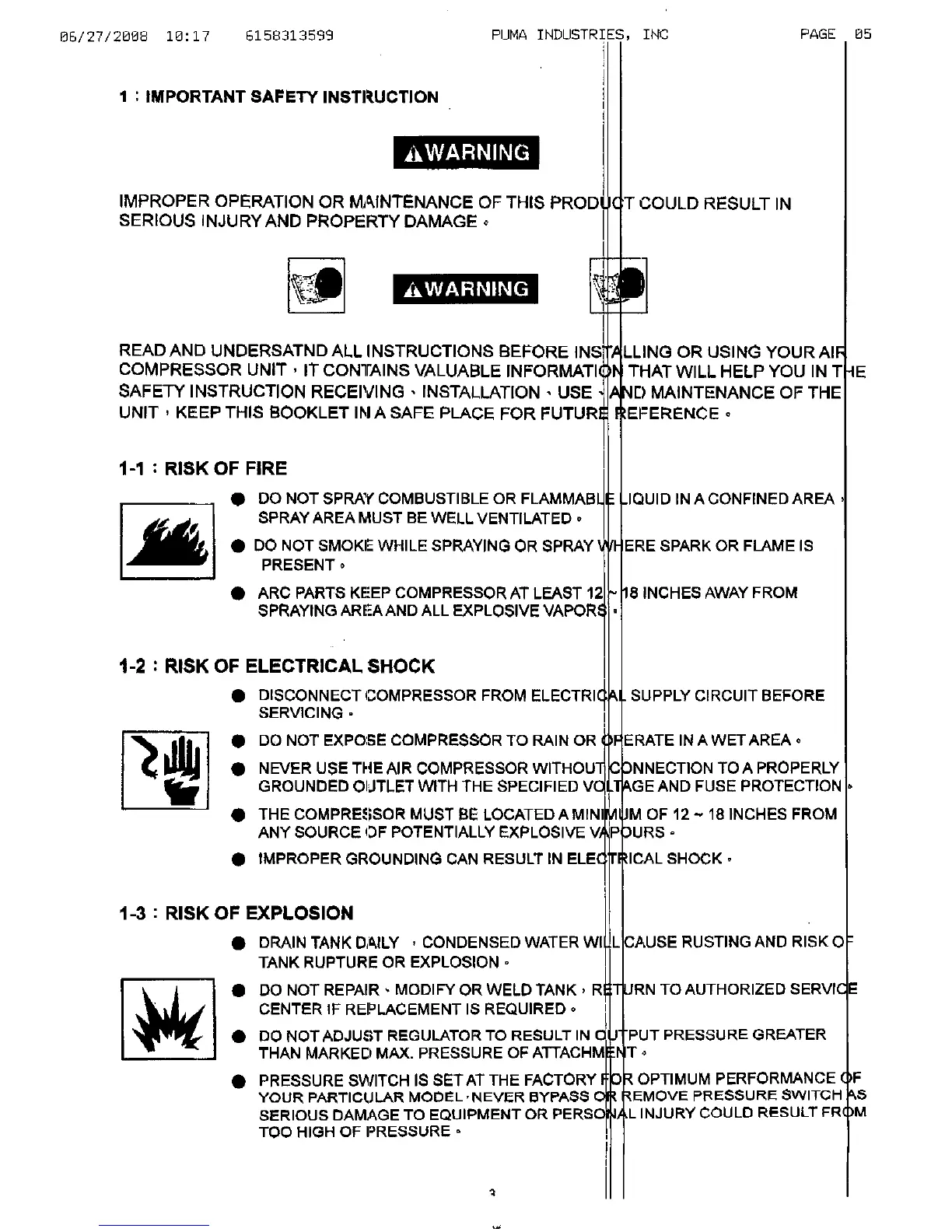 Puma pk5020 - IMPORTANT SAFETY INSTRUCTION; RISK OF FIRE; RISK OF ELECTRICAL SHOCK; RISK OF EXPLOSION
