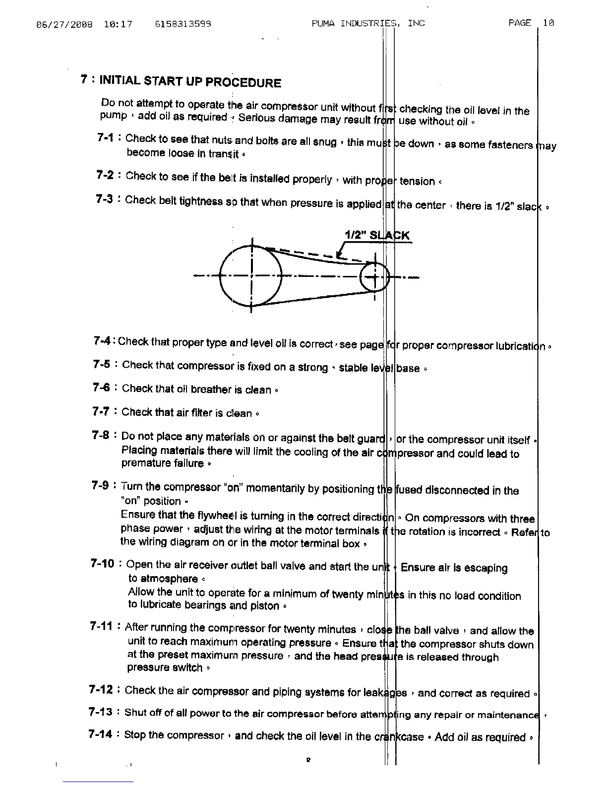 Puma pk5020 - INITIAL START UP PROCEDURE; Check that proper type and level oil is correct; Open the air receiver outlet ball valve and start the unit; After running the compressor for twenty minutes, close the ball valve