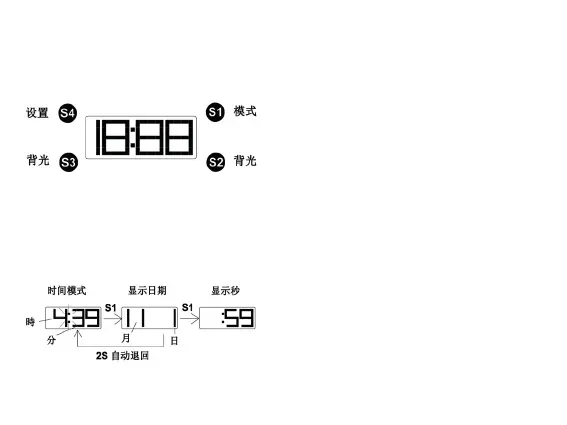 按 S1 显示日期, 放松按键 2s 将自动退回时间模式.