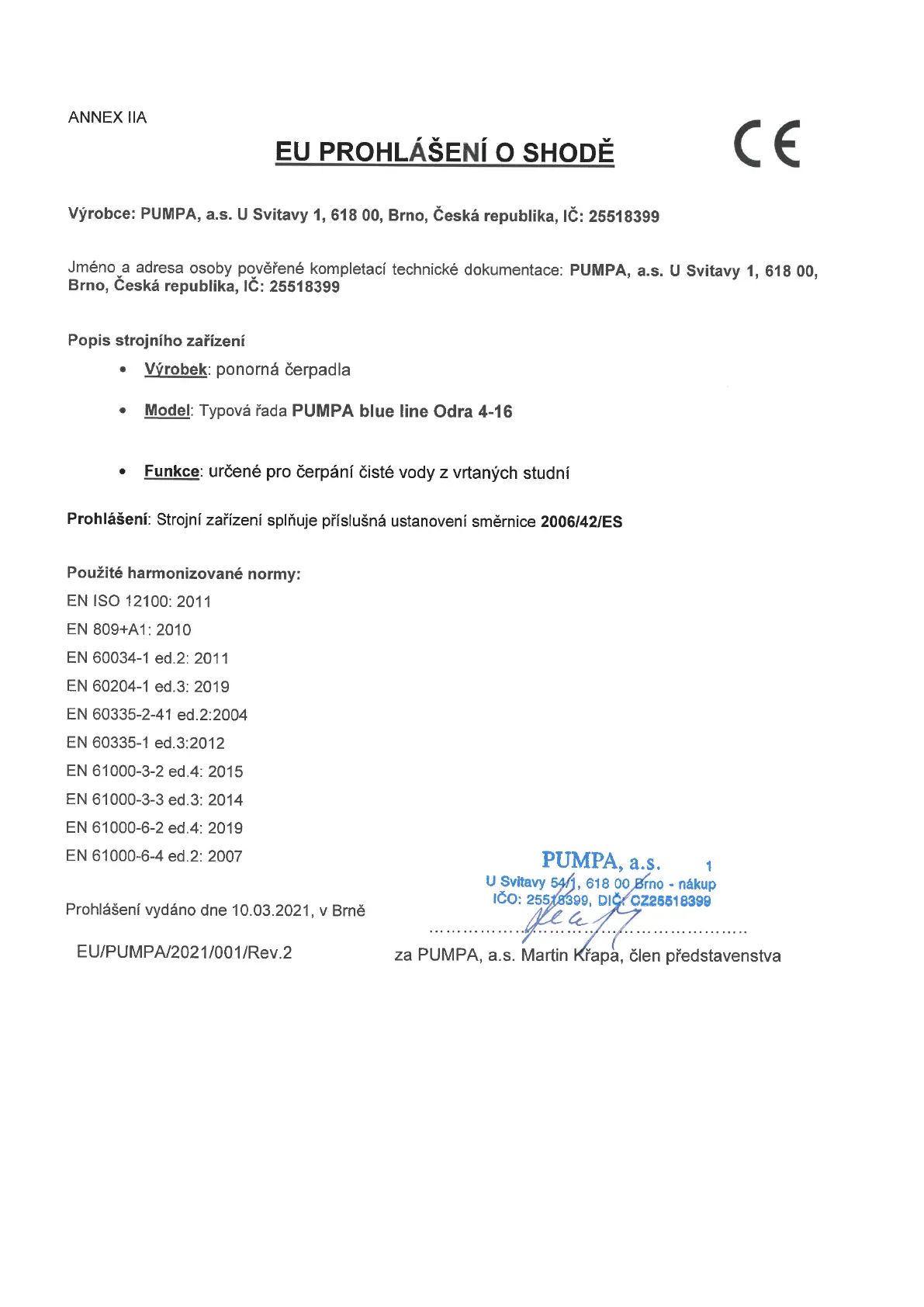 pumpa BLUE Series - Eu Prohlášení O Shodě