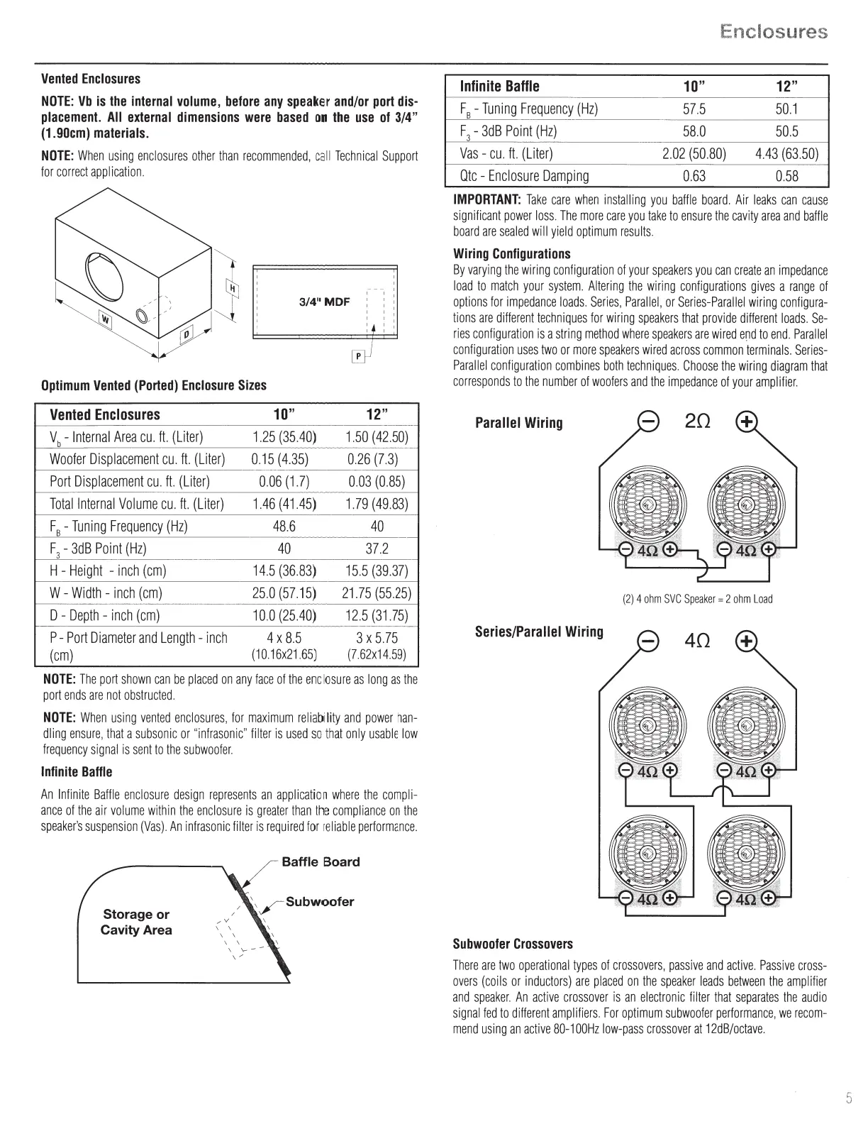 punch P2 - Enclosure Specifications and Wiring; Optimum Vented Enclosure Sizes; Infinite Baffle Specifications; Wiring Configurations Guide