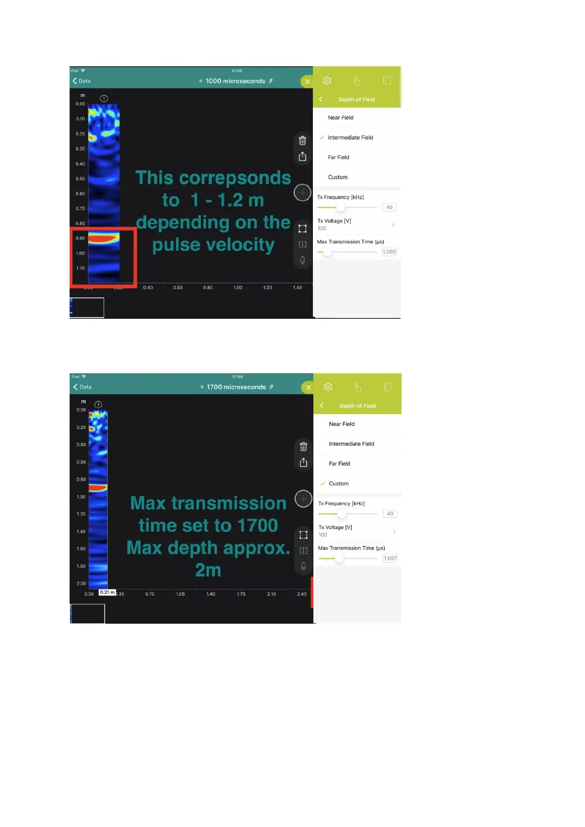 The maximum transmission time is 2’500 microseconds. The maximum depth will be around