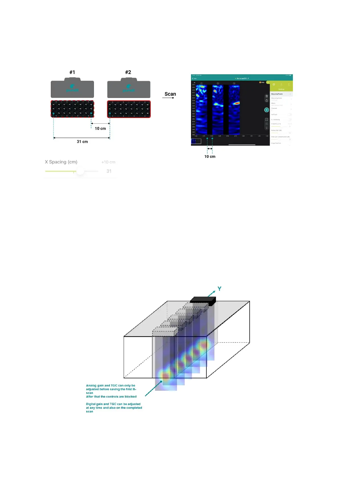 TGC must be adjusted before saving the first B-scan. Switch to the B-scan view to adjust the