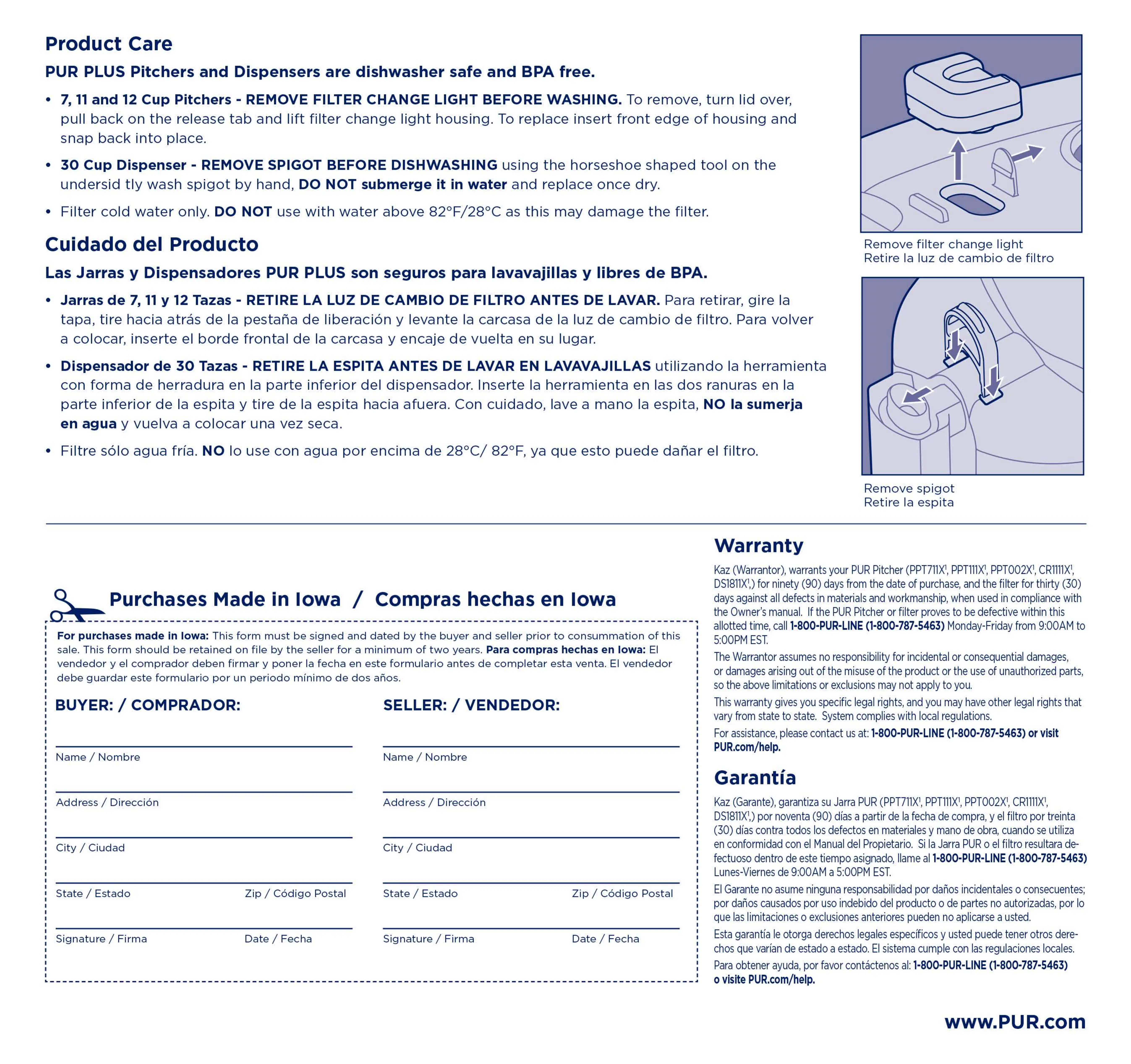 PUR PLUS Pitchers and Dispensers are dishwasher safe and BPA free.
