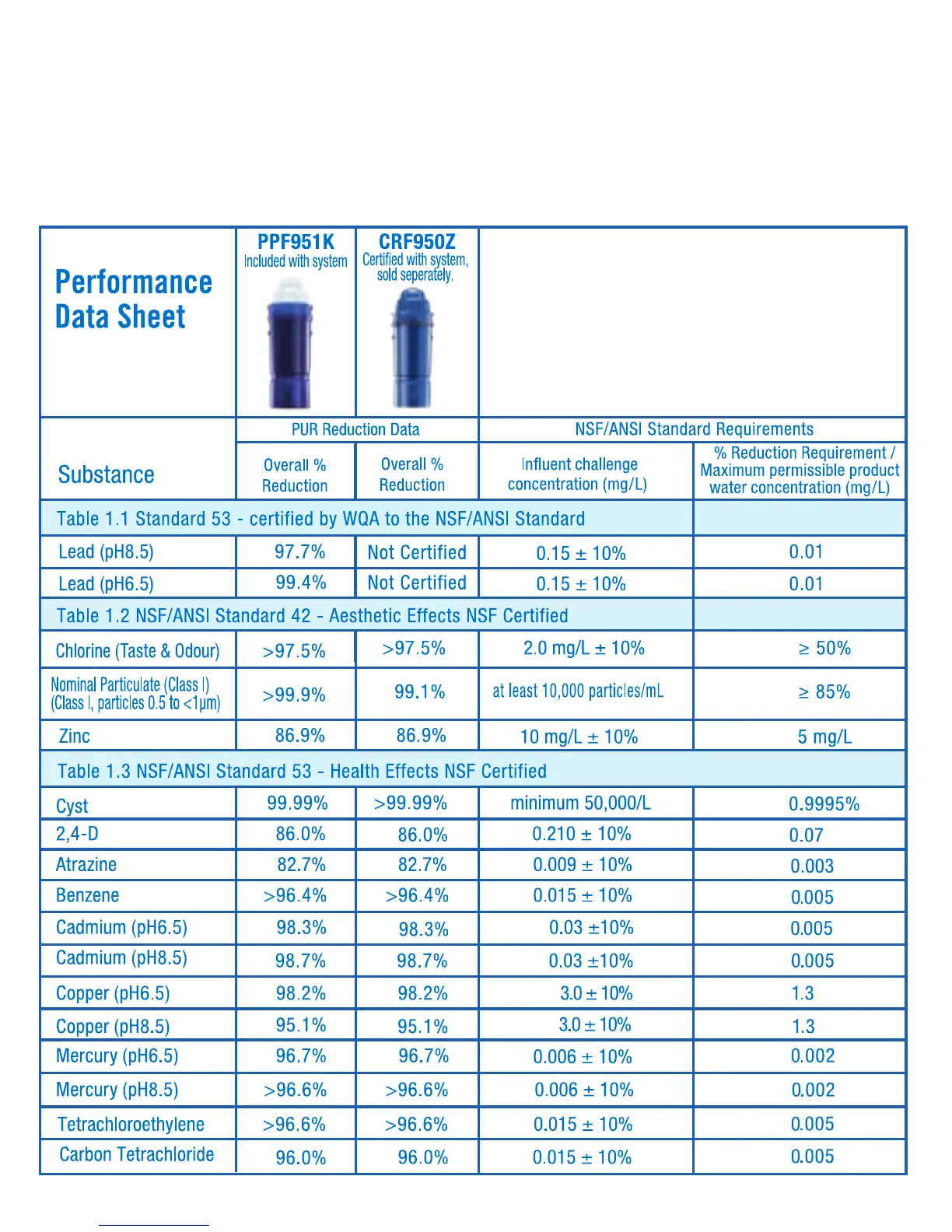 These systems have been tested according to NSF/ANSI 42, 53 and 401 for reduction of the substances