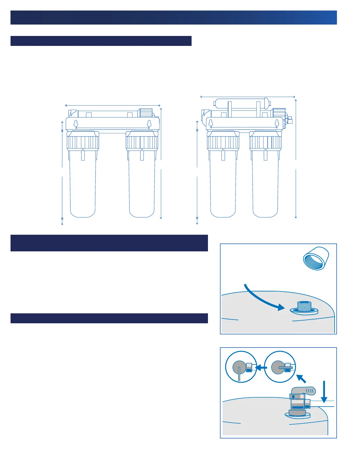 raccords de montage et de plomberie. Pour changer les cartouches de filtre, il faut un dégagement de 2 po sous les boîtiers de filtre.