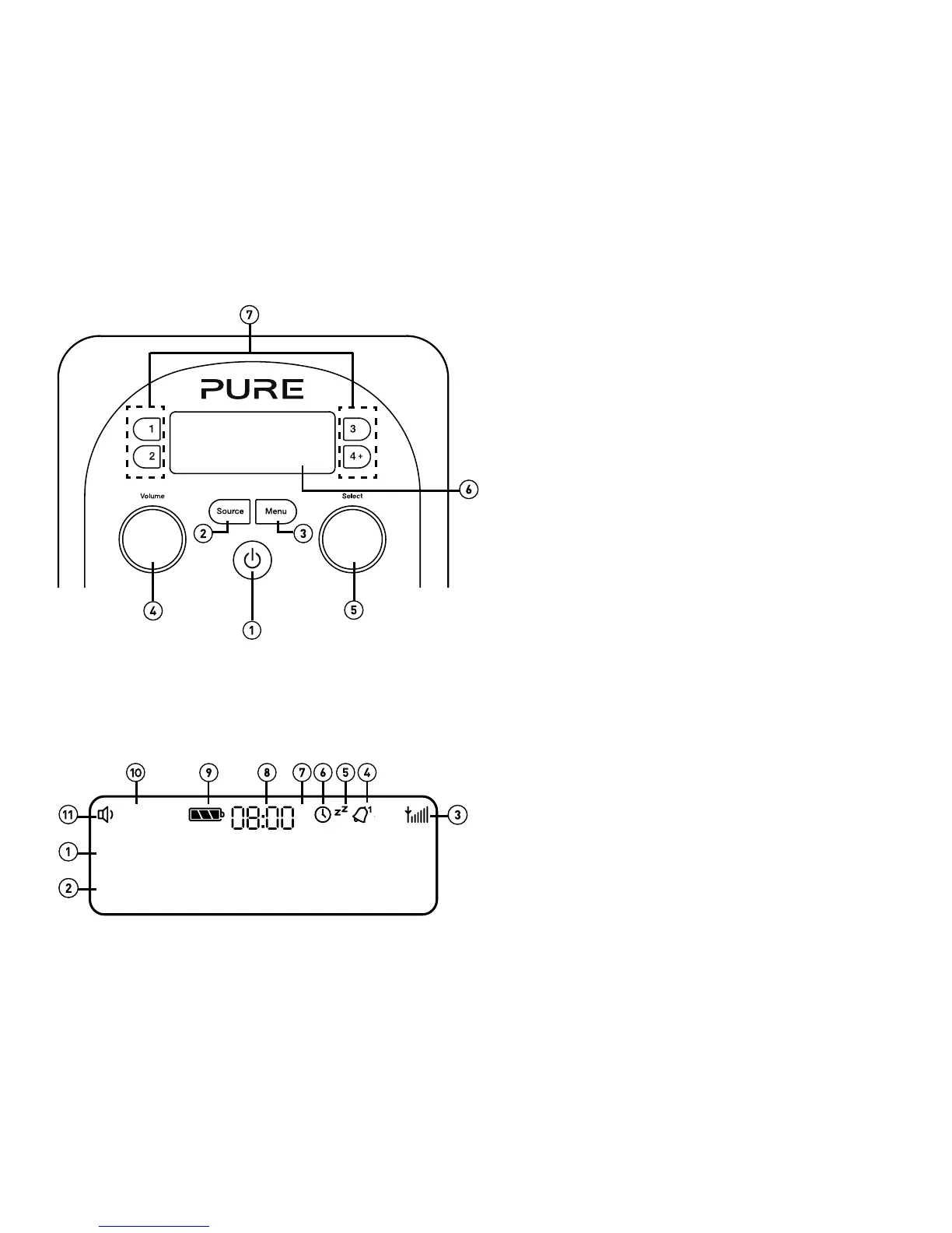 7. Presets 1 - 4+: Store up to 10 digital or 10 FM radio