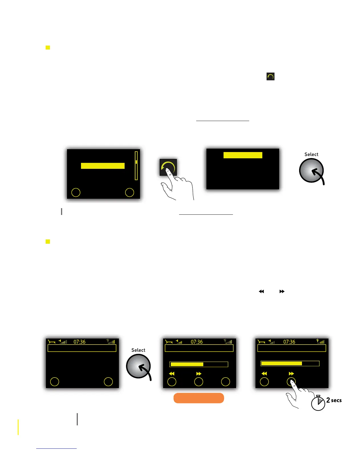1 When a programme or podcast is playing, push the Select dial to pause the current audio and