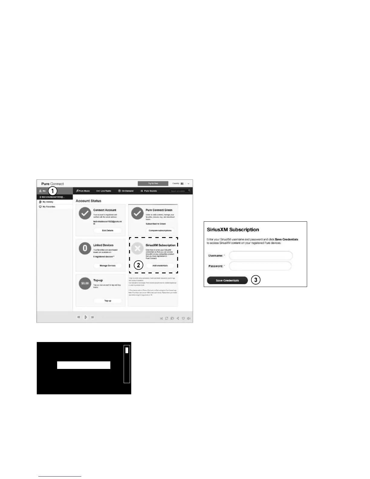 Remarque: Vous aurez besoin de relier votre Evoke à votre compte SiriusXM sur le site Pure Connect