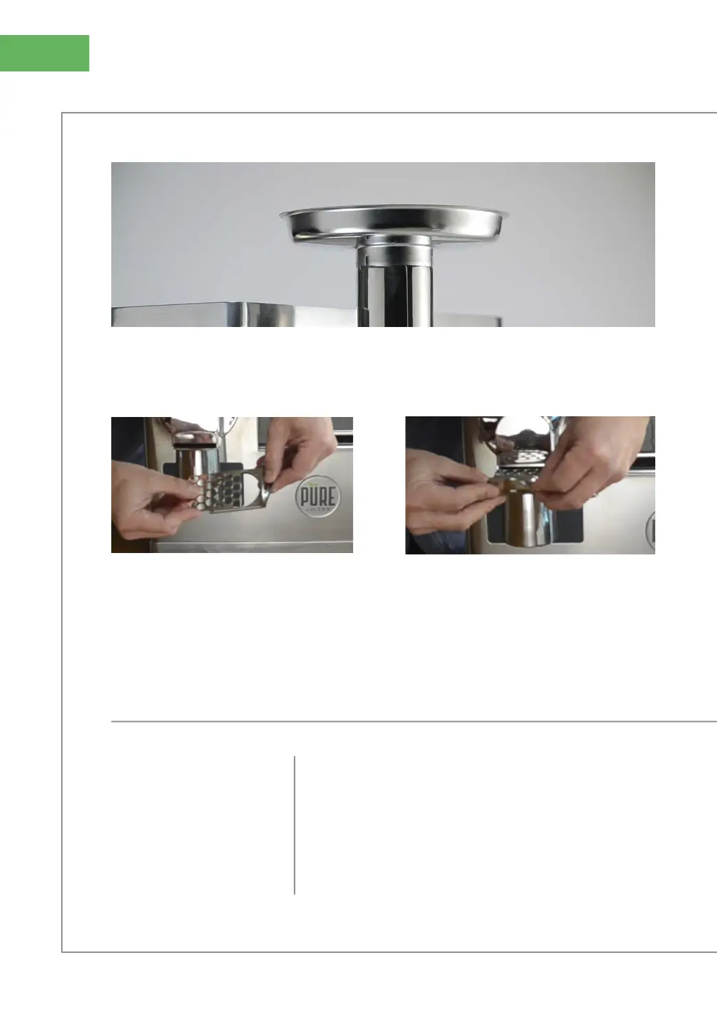 3. Install the feed pan at the top of the feed tube; press firmly into place.