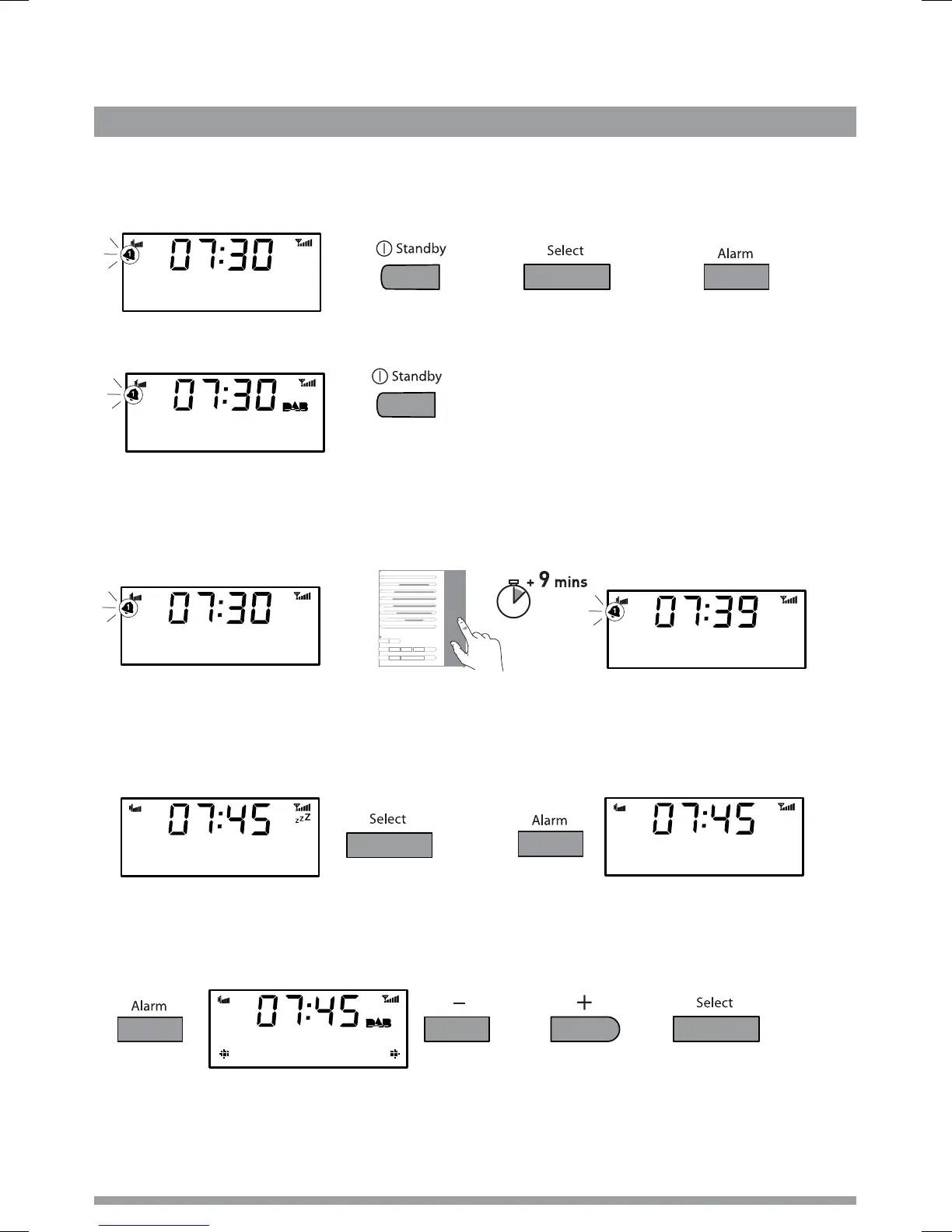Drücken Sie Alarm und scrollen Sie auf ‘Snooze time’. Mit den +/− Tasten wählen Sie einen Wert
