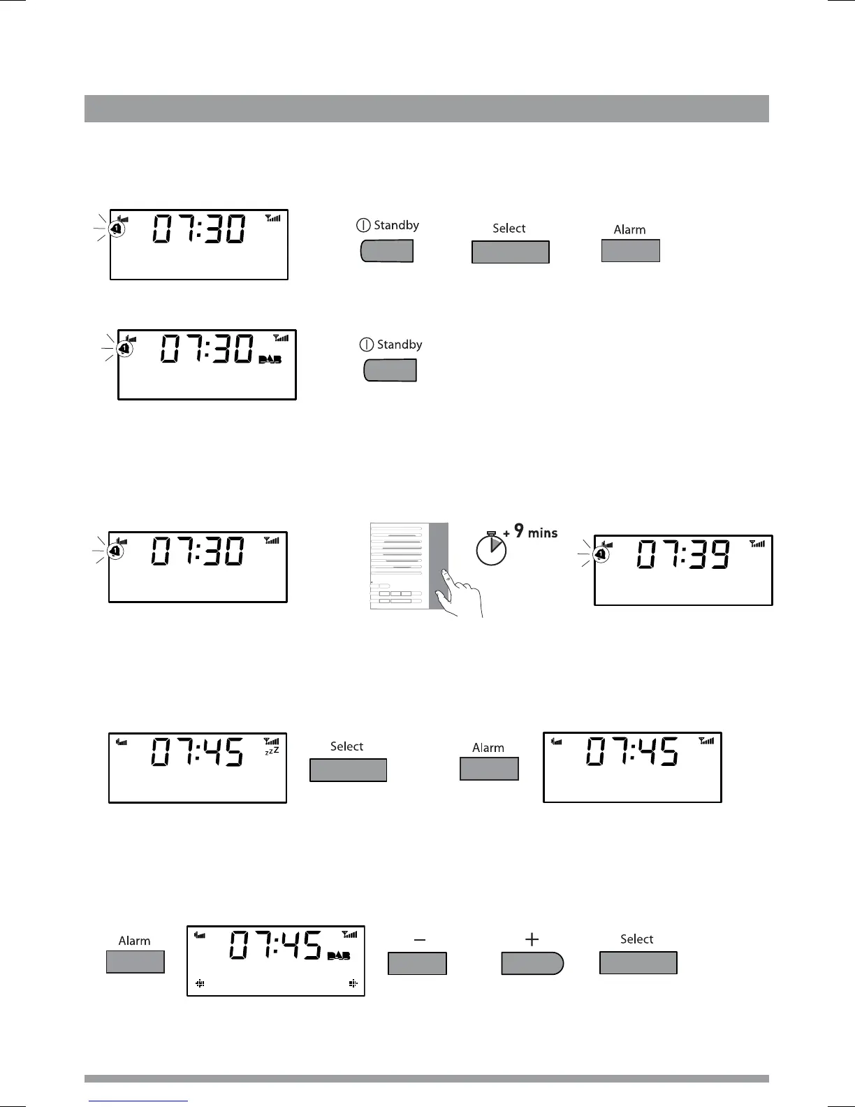 choix sur la touche Alarm ou Select, ou appuyez sur la touche Standby pour allumer la radio et