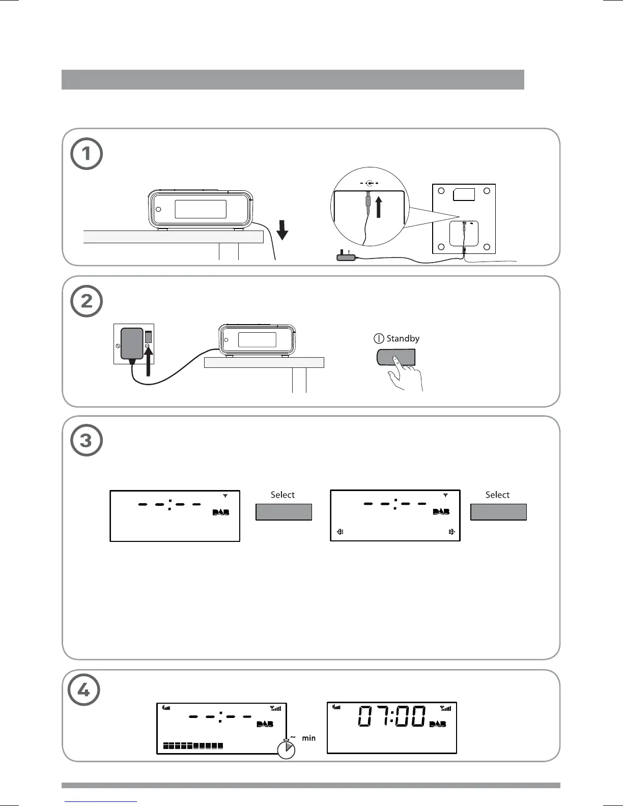 Plug the mains adapter into the mains supply and press the Standby button.