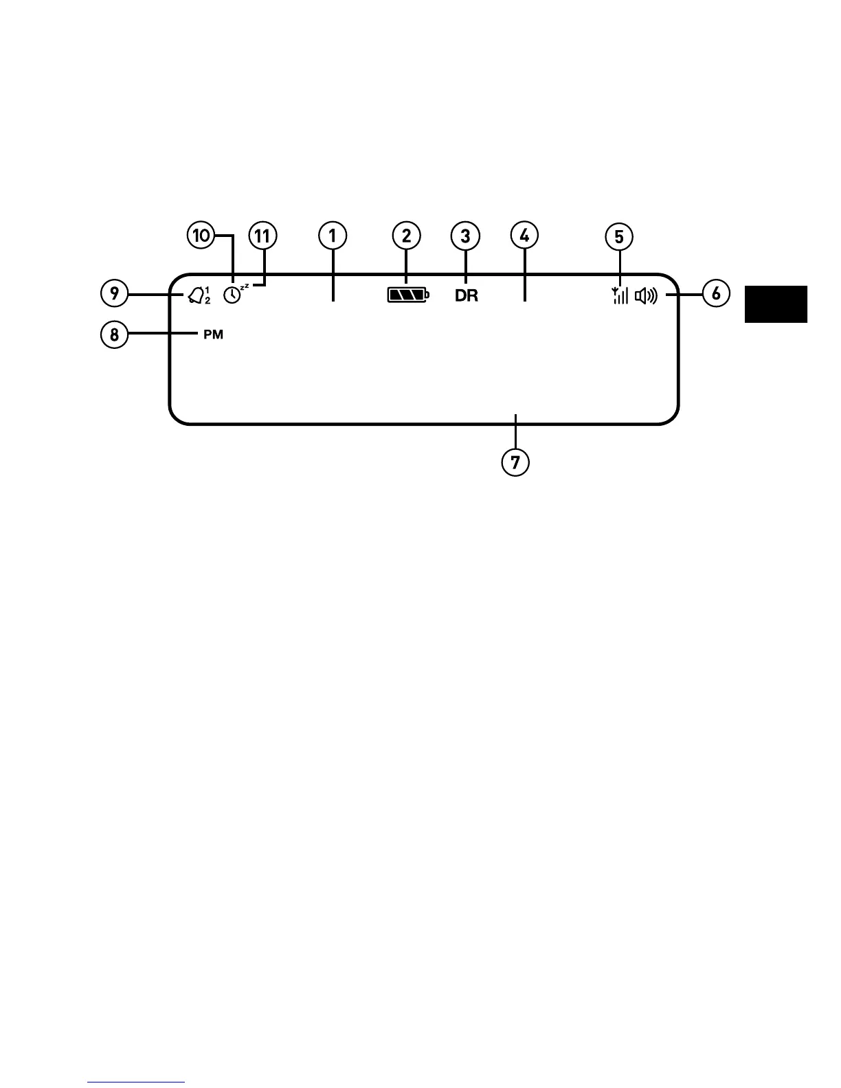 9. Indicator van wekker (indien ingesteld, zie pagina 11).