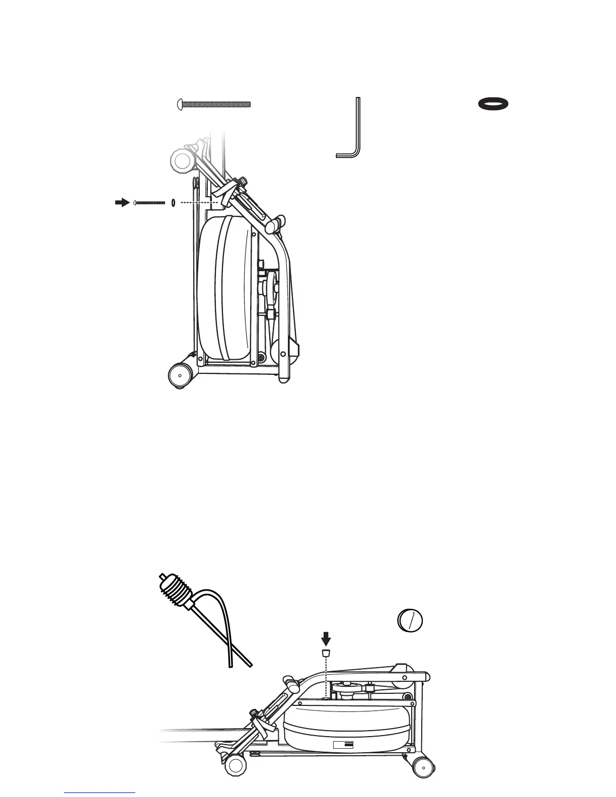 8. Stand the unit up. Use the Allen key (E) to install the rail bolt and washer through