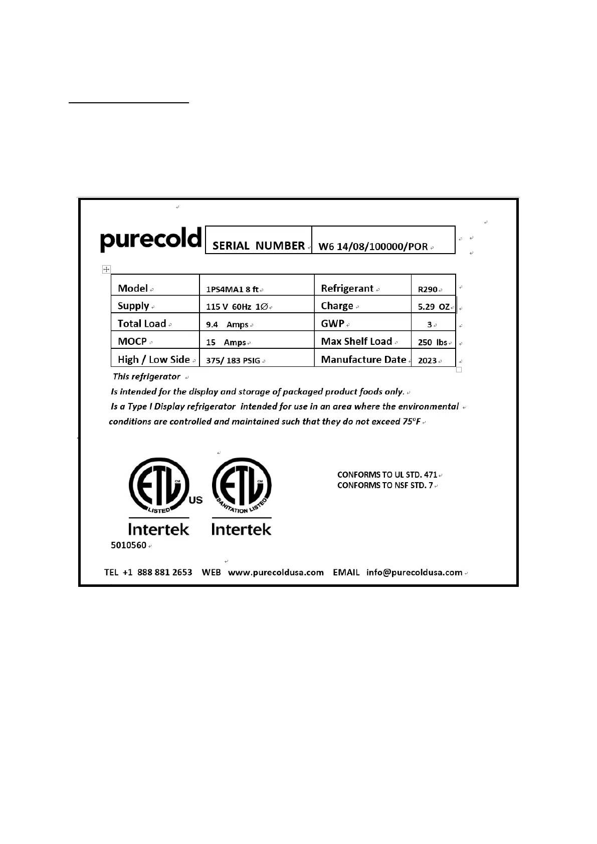 purecold 1PS4MA1 - Refrigeration Type and Specifications