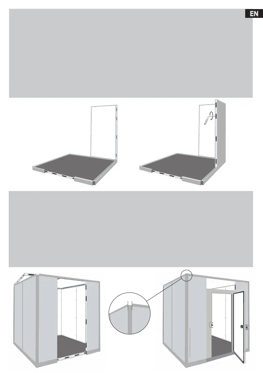 (Piece C4). Position the openings of the fixing angles to the interior of the cold room.