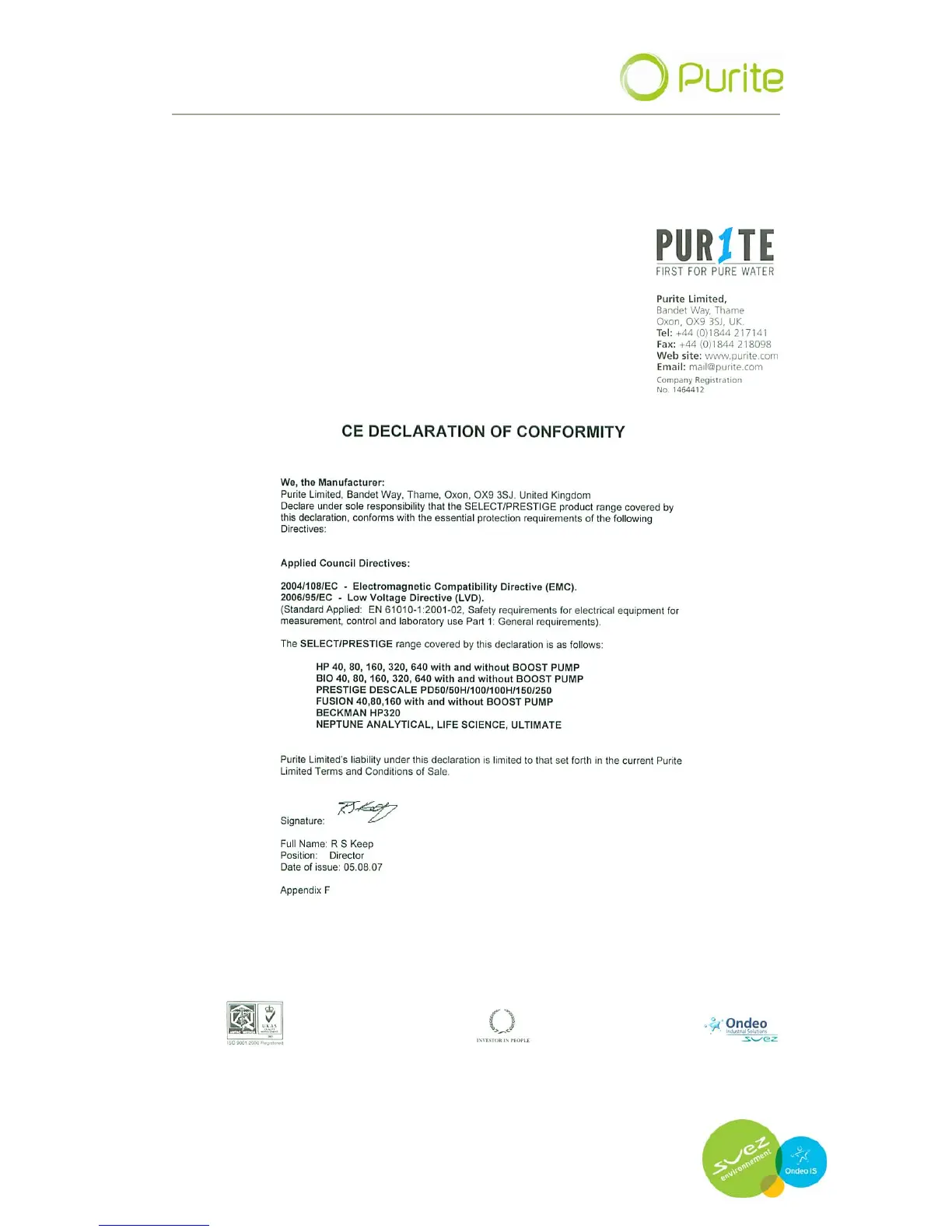 Purite Select Analyst - Appendix; CE Declaration