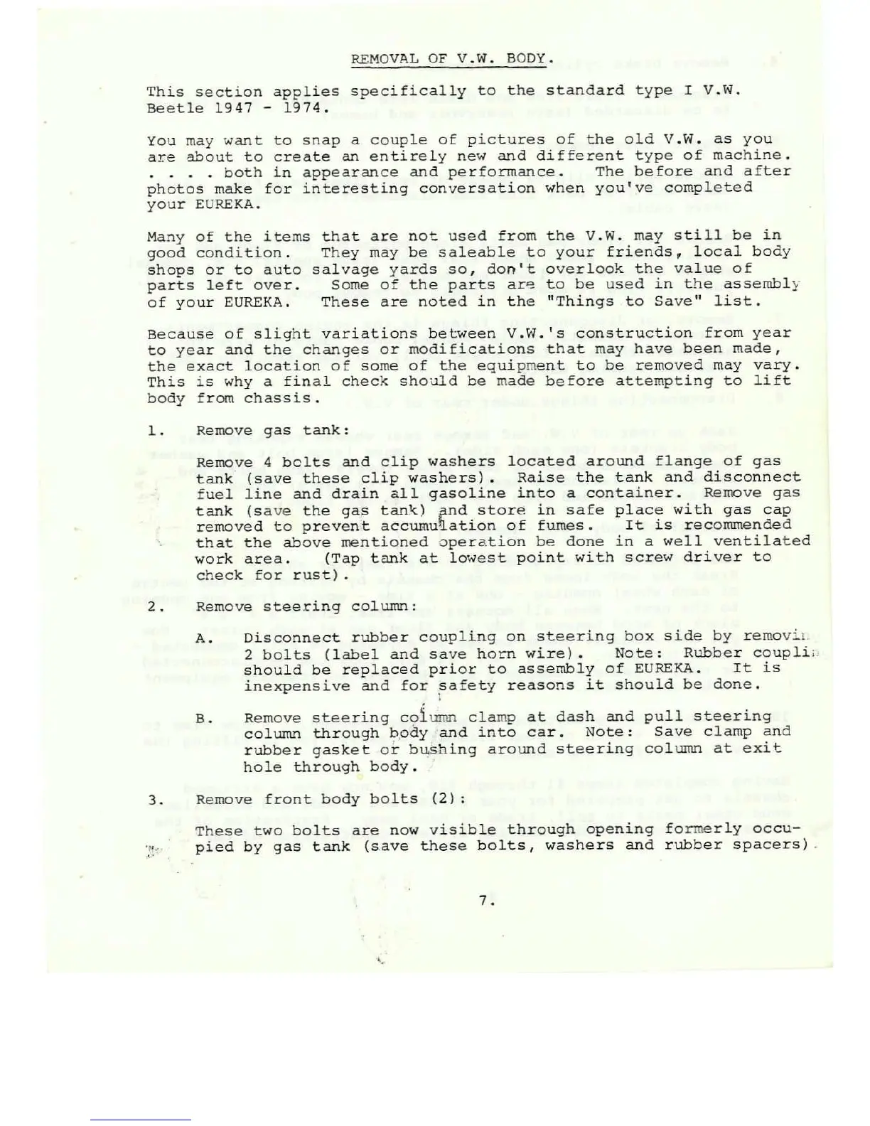 Purvis Eureka - Removing the VW Body from the Chassis; Gas Tank Removal Procedure; Steering Column Disconnection; Front Body Bolt Removal