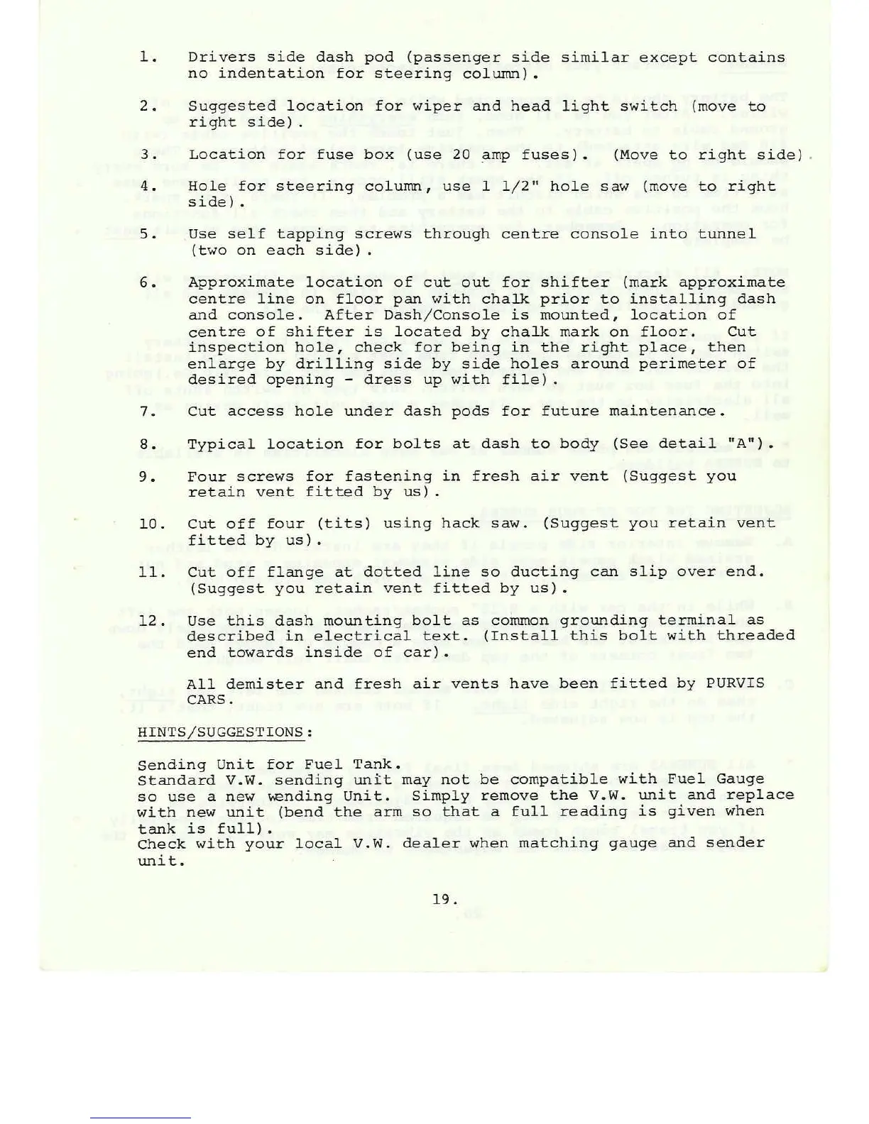 Purvis Eureka - Dash Pod and Interior Components; Dash Pod Component Placement; Shifter Access and Maintenance Holes; Fuel Tank Sending Unit Compatibility
