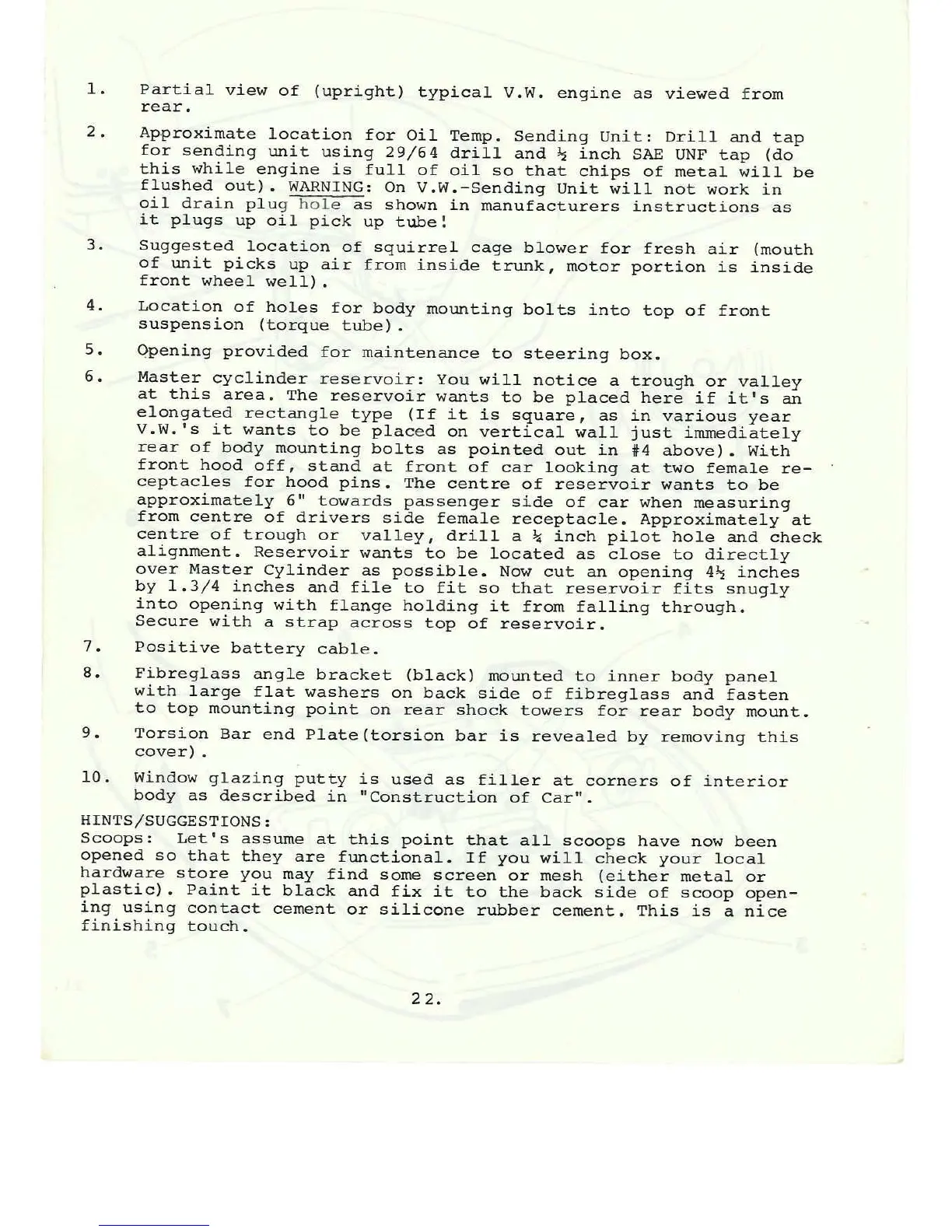 Purvis Eureka - Engine Compartment Details and Hints; Oil Temperature Sending Unit Installation; Fresh Air Blower Location; Master Cylinder Reservoir Placement