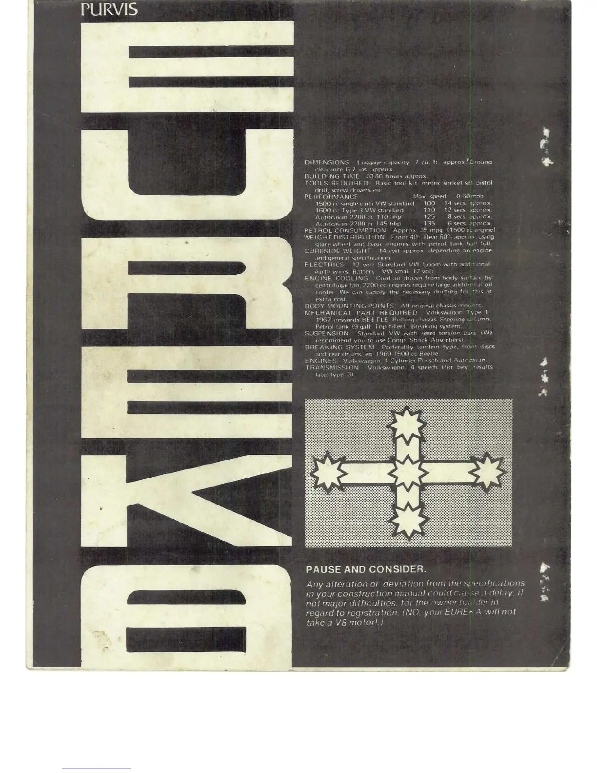 Purvis Eureka - EUREKA Specifications Summary; Vehicle Dimensions and Build Time; Performance and Fuel Consumption; Mechanical Requirements and Systems