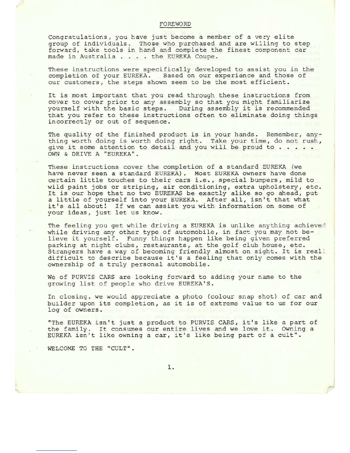 Purvis Eureka - Foreword and Assembly Guidance; Welcome to the EUREKA Cult; Assembly Instruction Importance