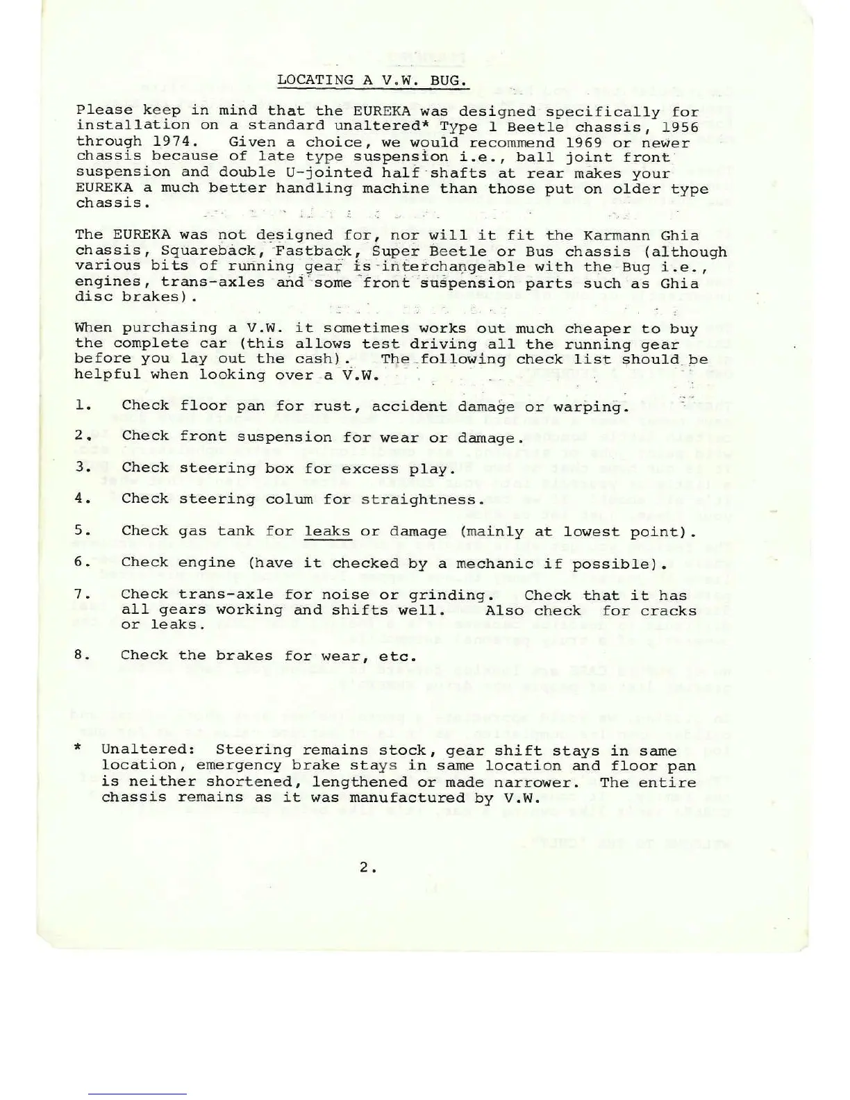 Purvis Eureka - Selecting a Volkswagen Chassis; Recommended Chassis Specifications; Incompatible Chassis Types; VW Chassis Inspection Checklist