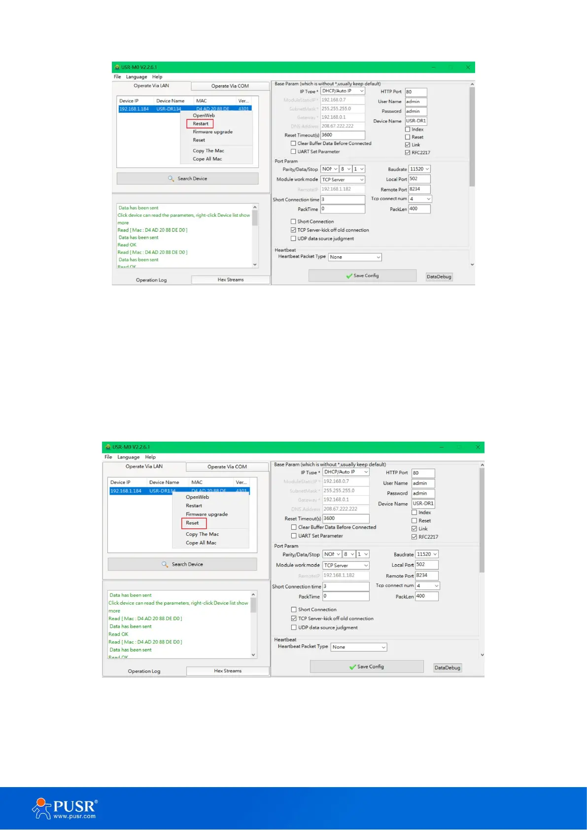 The configuration utility provides the function to restore the serial device server to factory default settings. If