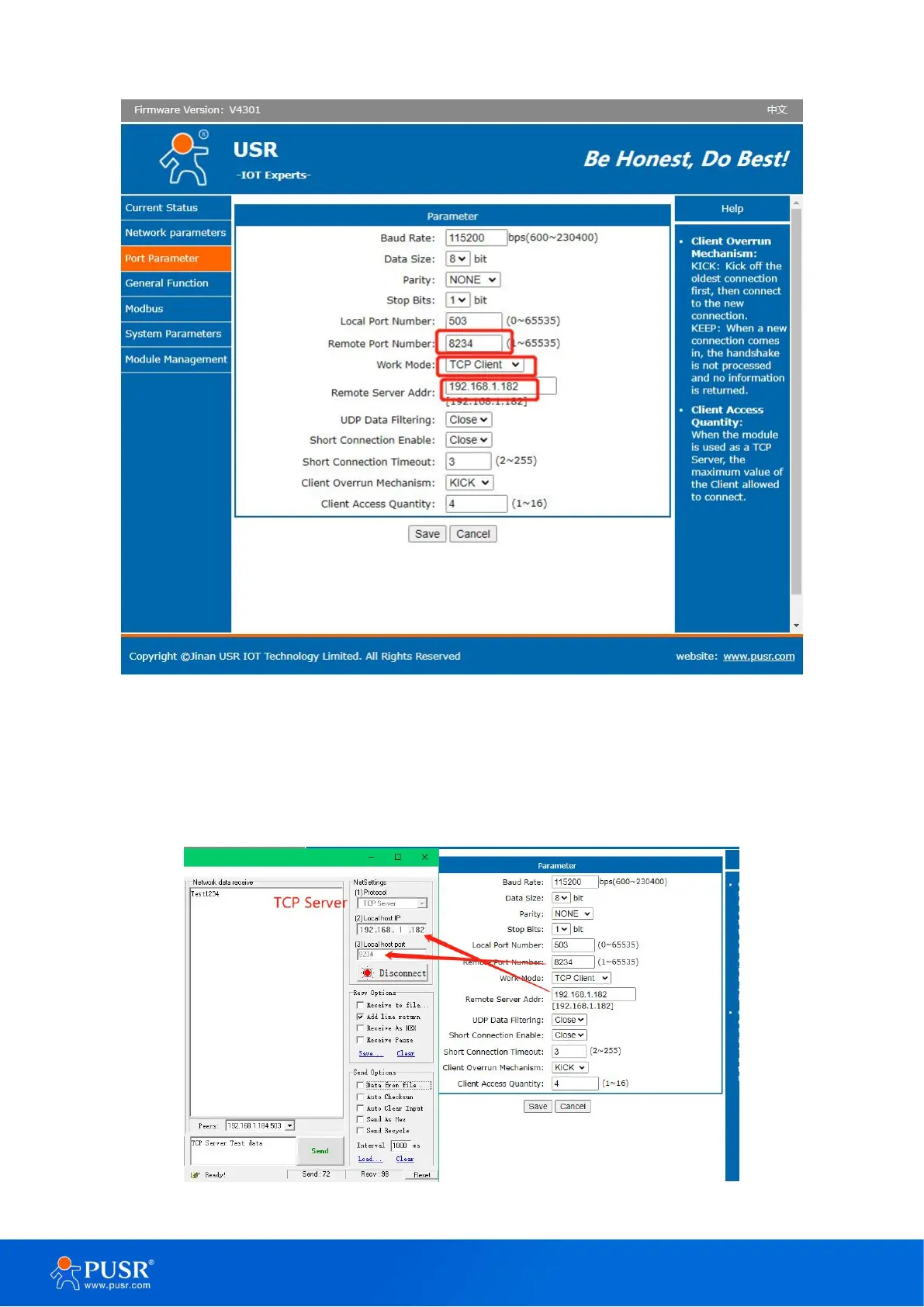 remote port of USR-DR134. After the connection is established, we can see the IP and port of USR-TCP232-306, as