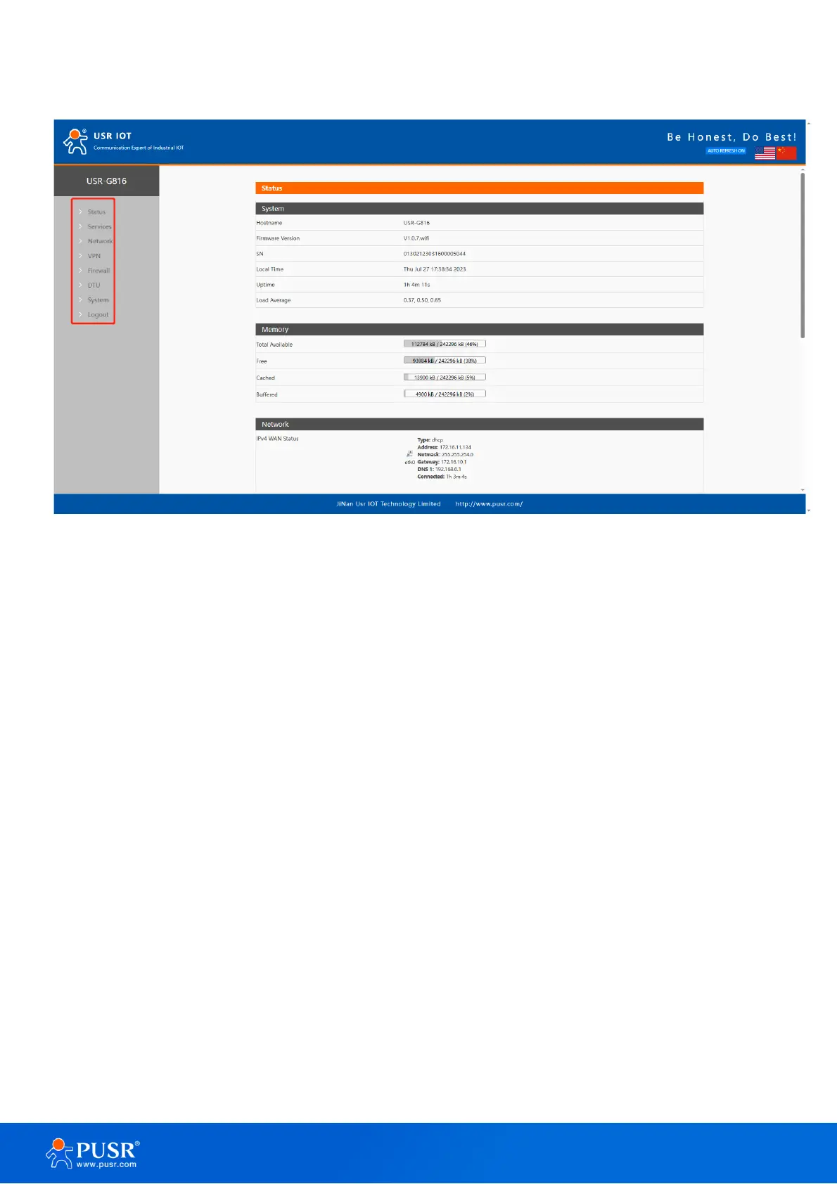 Users can get the basic information of USR-G816, such as firmware version, running time, IPv4 WAN status,