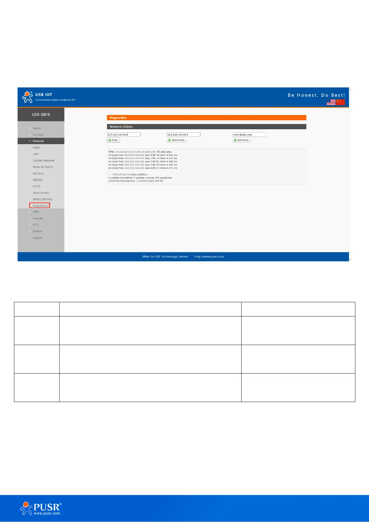 USR-G816 provides online diagnostic functions, including Ping tools, routing analysis tools, and DNS viewing