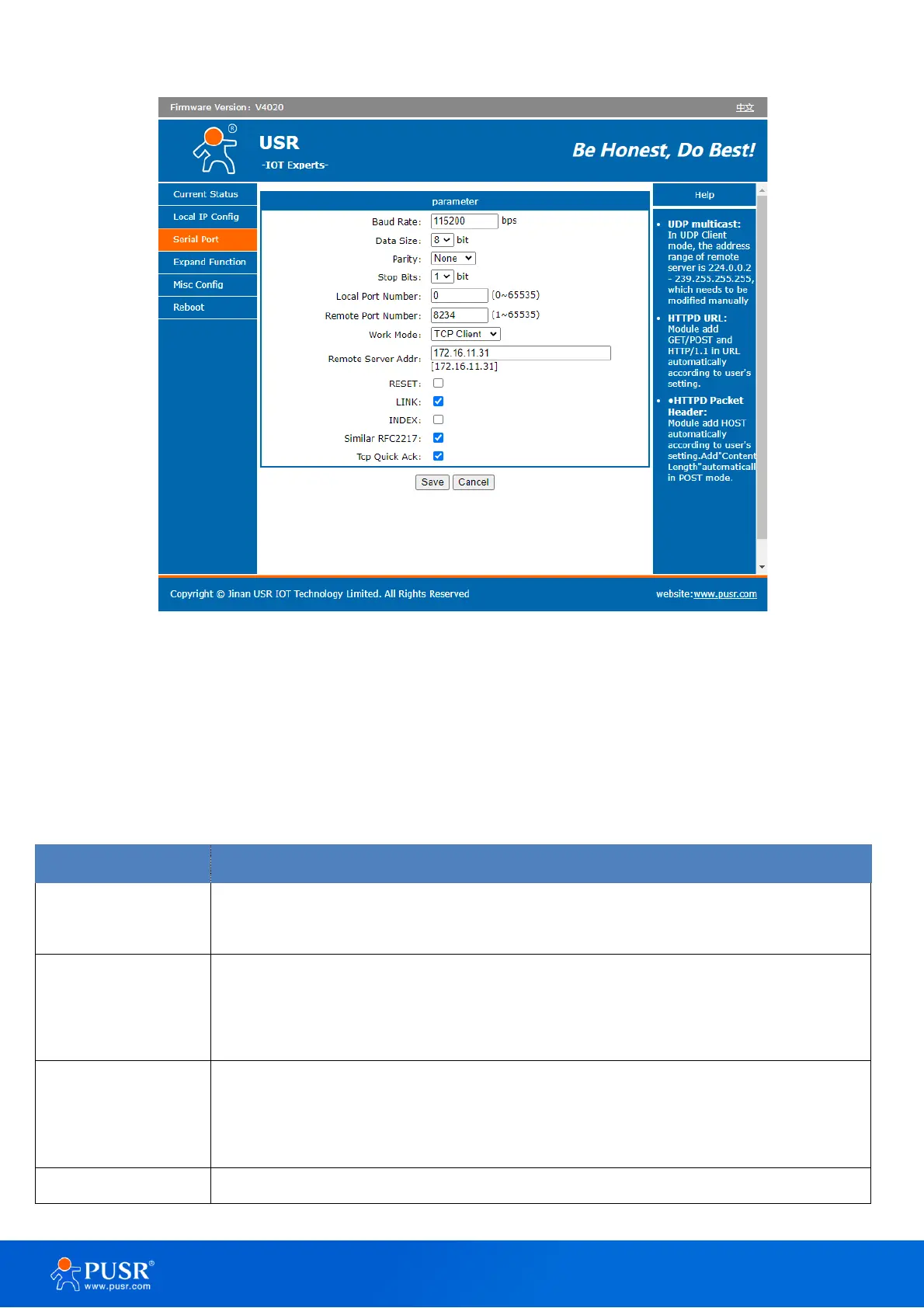 Table 8. Detail description of serial port