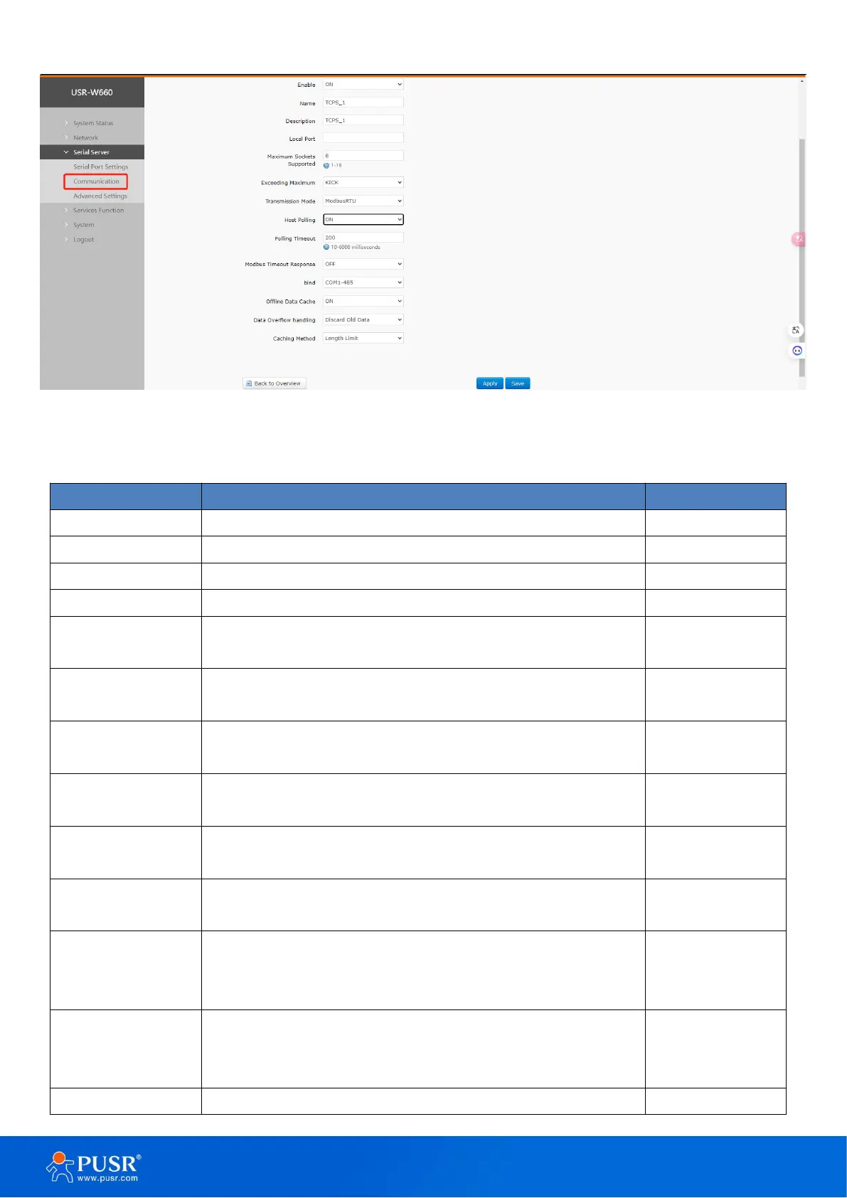 Figure 30. TCP server parameters settings page