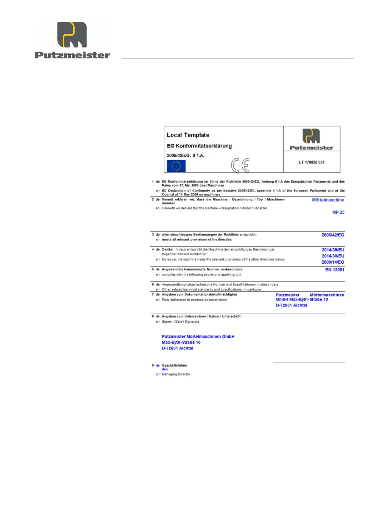 Putzmeister MP 25 - Sample EC Declaration of Conformity