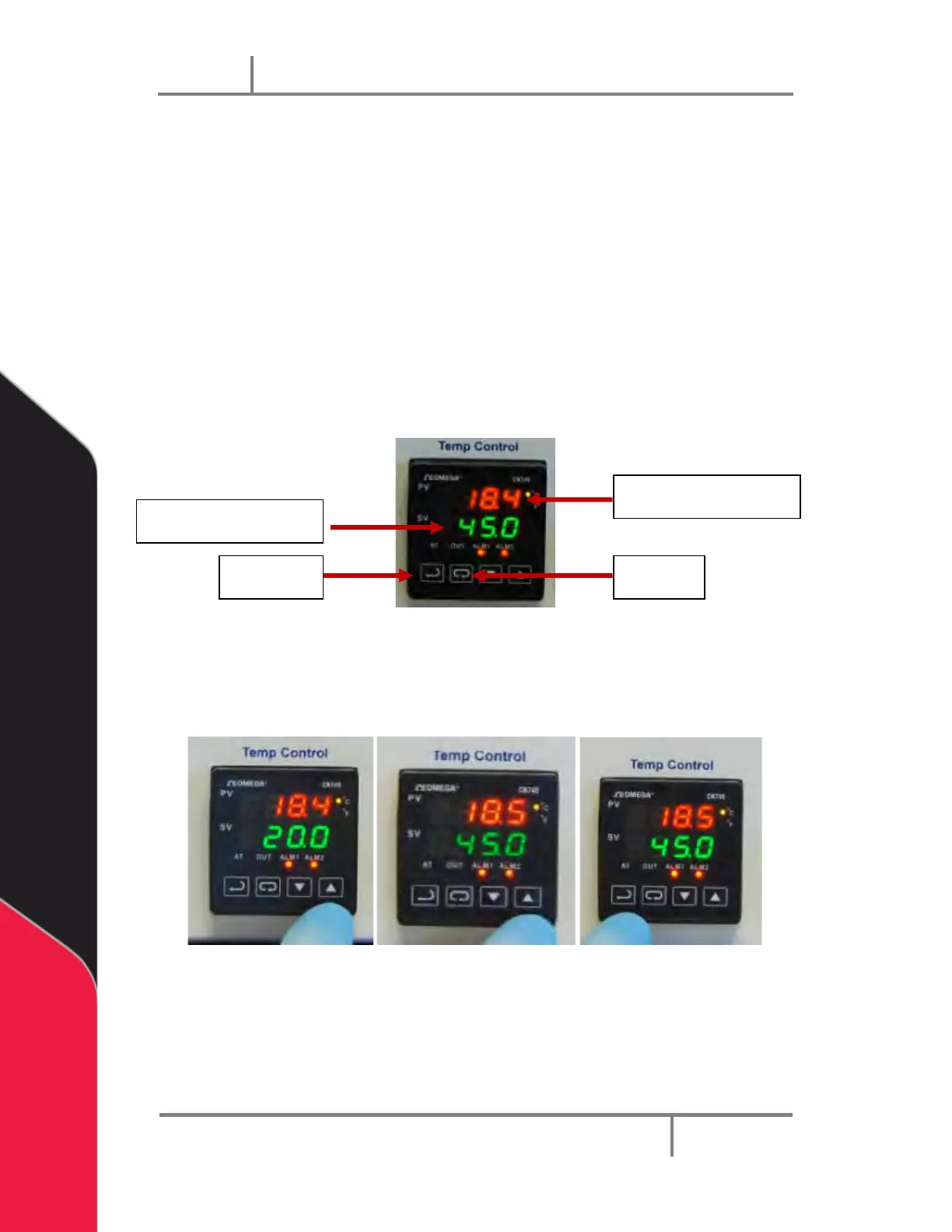 the top line, and the set point temperature (SV) on the bottom line of the display.