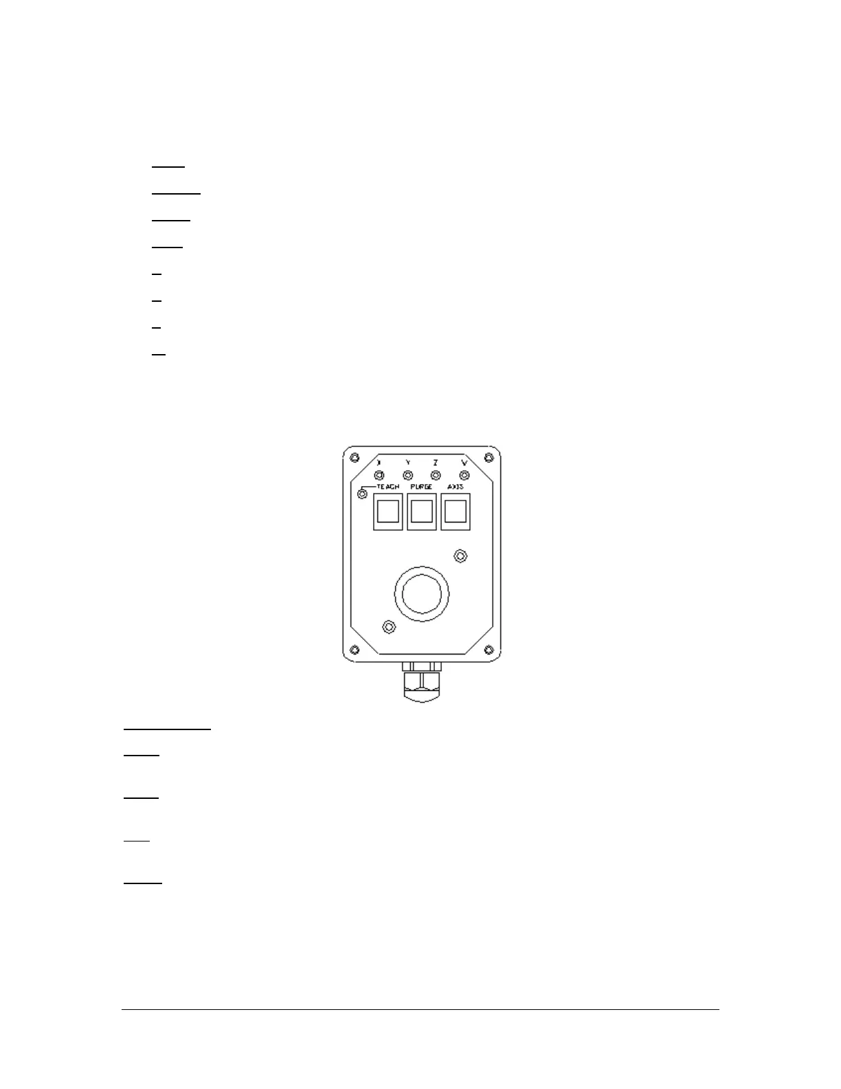 button, purge button, axis selection button, and LED indicators for selected axes and teach function.