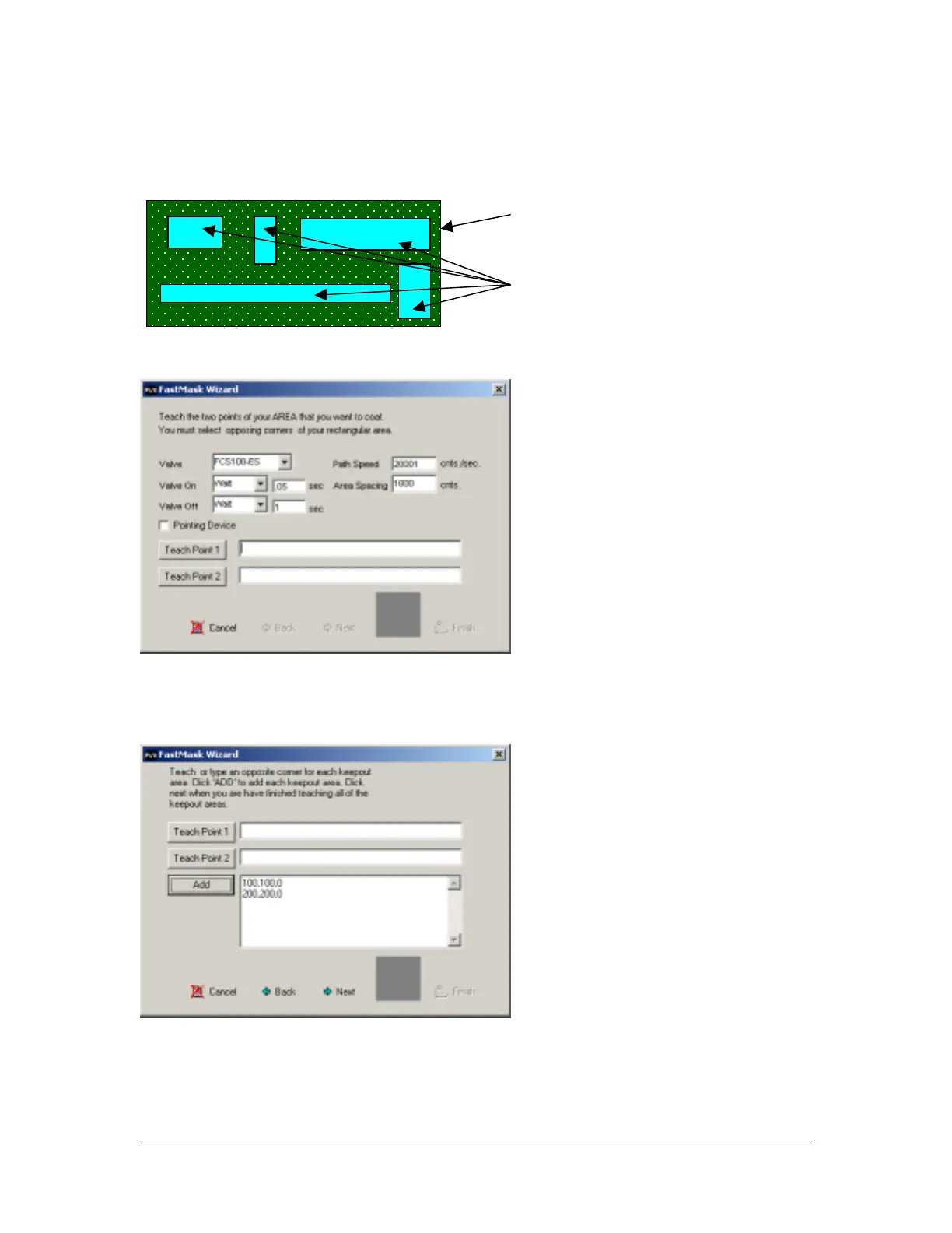 Select the appropriate valve parameters, then teach the opposing corners of the area to be coated, point 1