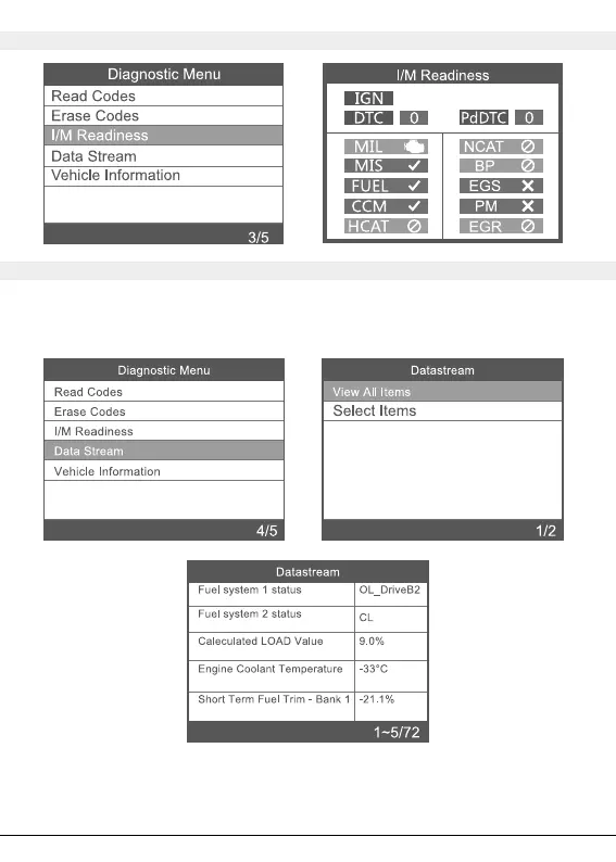 Använd rullningsknappen UPP/NED för att välja Dataström på diagnostikmenyn och